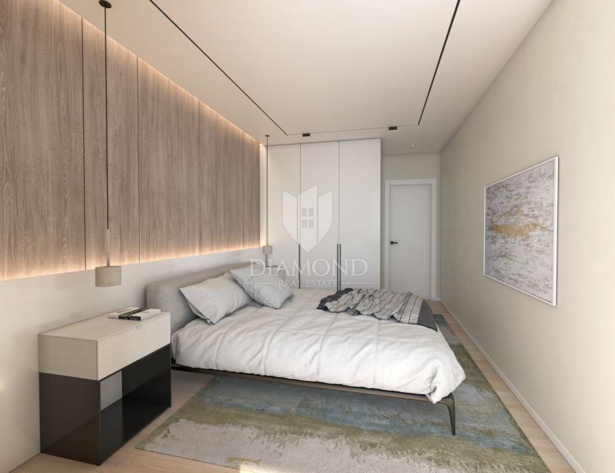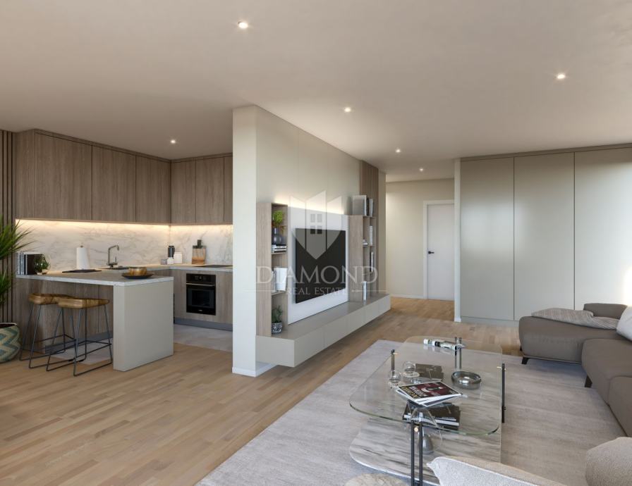 Stan je smješten na 1. katu moderne novogradnje sa liftom. Ukupna površina stana iznosi 65.40 m2. Sastoji se od dnevnog boravka sa kuhinjom otvorenog tipa, 2 spavaće sobe i kupaonice. Iz dnevnog boravka se izlazi na natkrivenu terasu sa pripremom za instalacije za ljetnu kuhinju. Stan se gradi od visokokvalitetnih materijala sa podnim grijanjem na toplinsku pumpu i hlađenjem na ventil konvektore. Stolarija će biti aluminijska sa troslojnim staklima. Budući vlasnik može birati želi li kupiti vanjsko parkirno mjesto po cijeni od 20.000 eura ili garažno parkirno mjesto po cijeni od 30.000 eura.