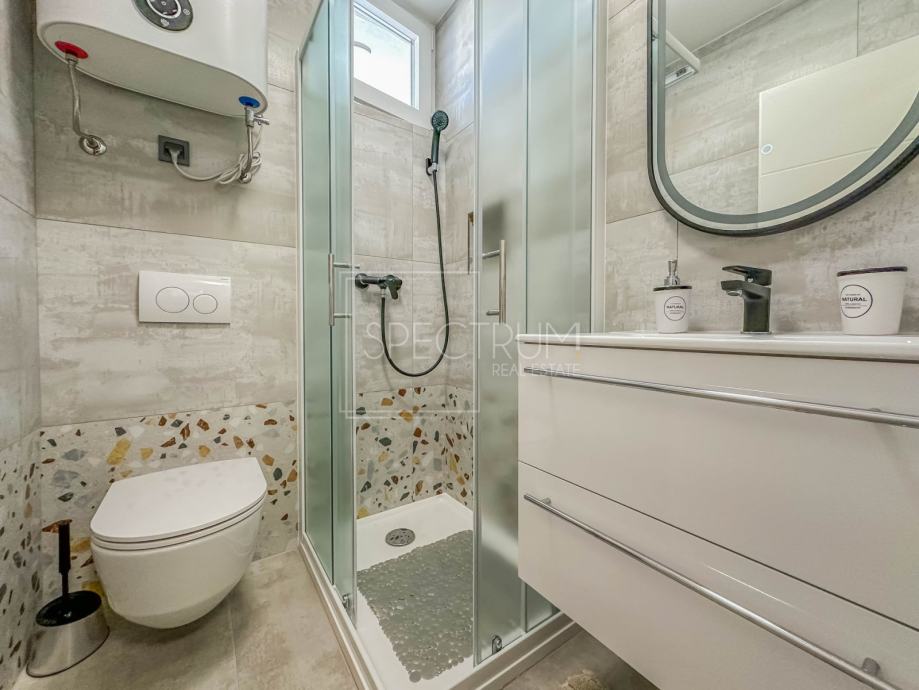 Stan se nalazi na 4.katu stambene zgrade. Površina stana iznosi 21.71 m2. Stan se sastoji od jedne boravišno spavaće prostorije, kuhinje, kupaonice i natkrivene terase sa koje se pruža lijepi pogled na more i na grad Umag. Stan se prodaje namješten. Stan je nedavno kompletno renoviran, uključujući instalacije struje i vode. Zgrada je isto nedavno renovirana, nova fasada i krov. Stanu pripada spremište koje se nalazi u prizemlju. Također, u prizemlju se nalazi i zajedničko spremište za bicikle. Parking se nalazi odmah pored same zgrade.