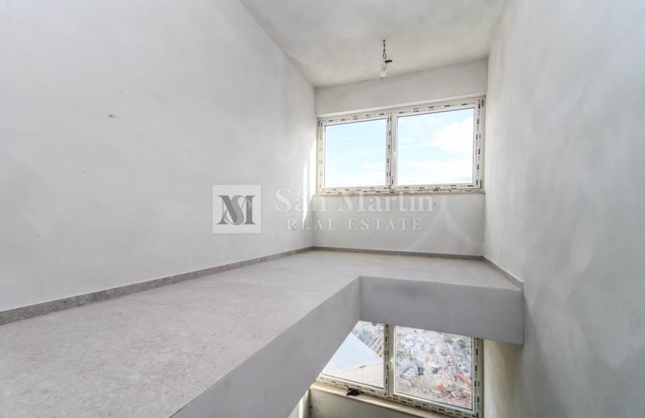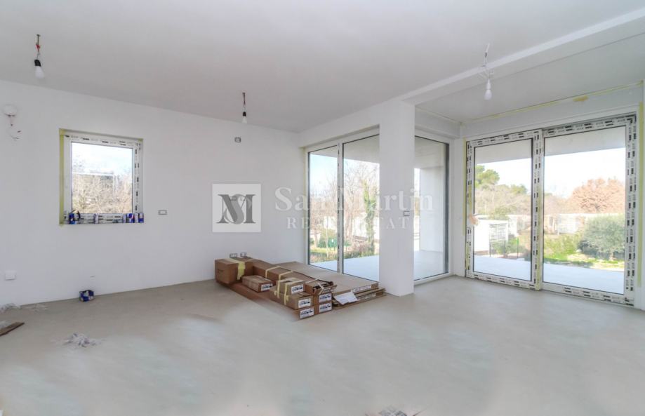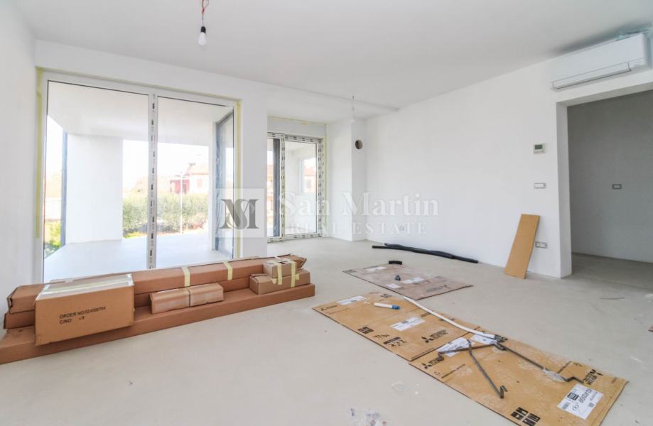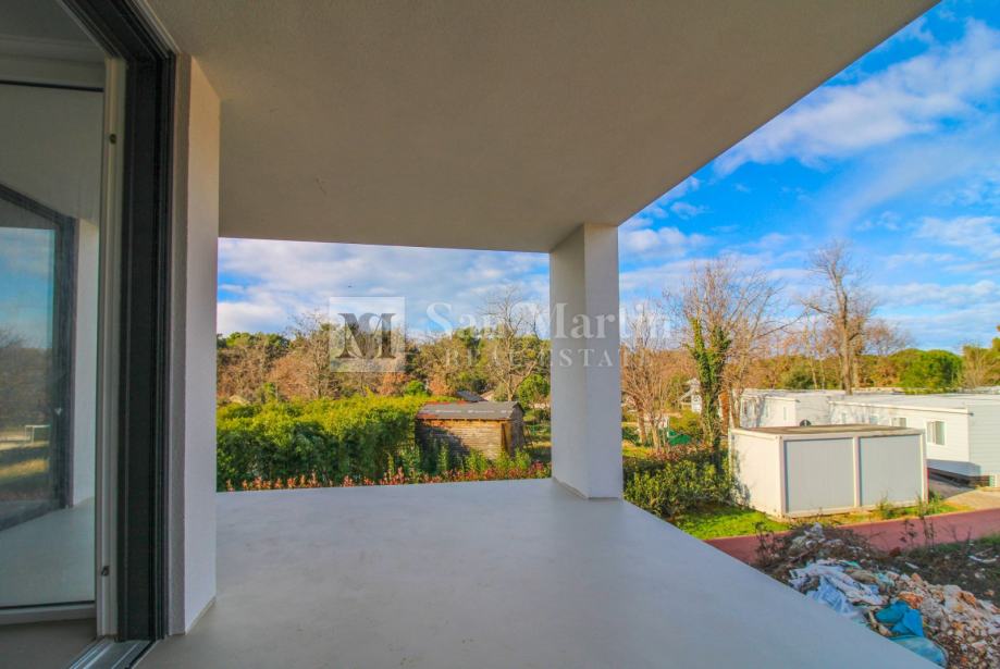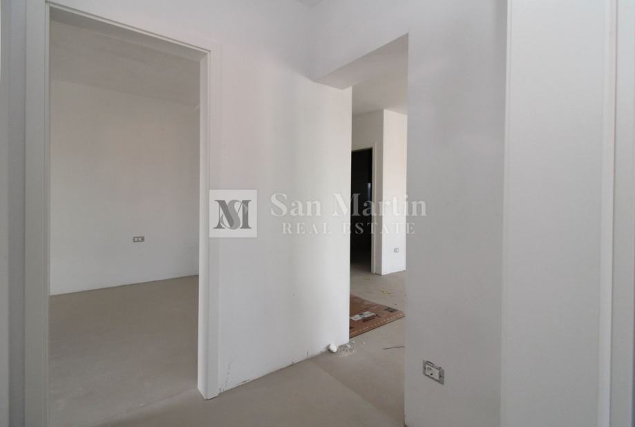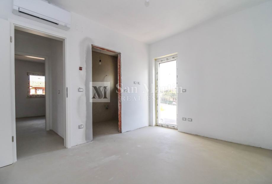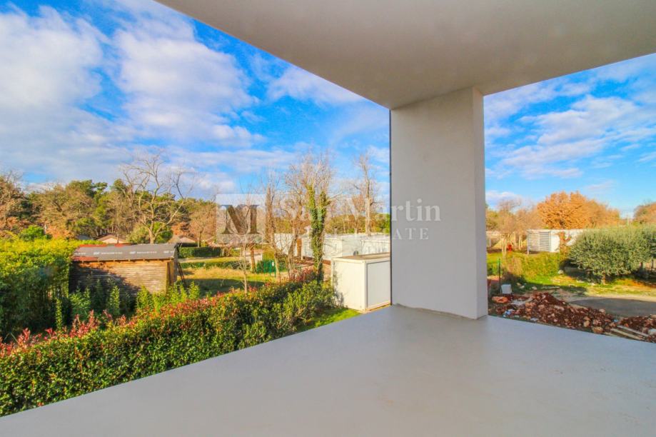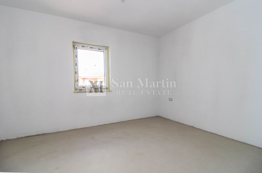 Stan se nalazi na 2. katu novogradnje od 5 stambenih jedinica. Sastoji se od velikog dnevnog boravka open-space koncepta sa kuhinjom i blagovaonom sa izlazom na natkrivenu terasu, 2 spavaće sobe i 2 kupatila. Zgrada je građena po najvišim modernim standardima. Grijanje ja na dizalicu topline.