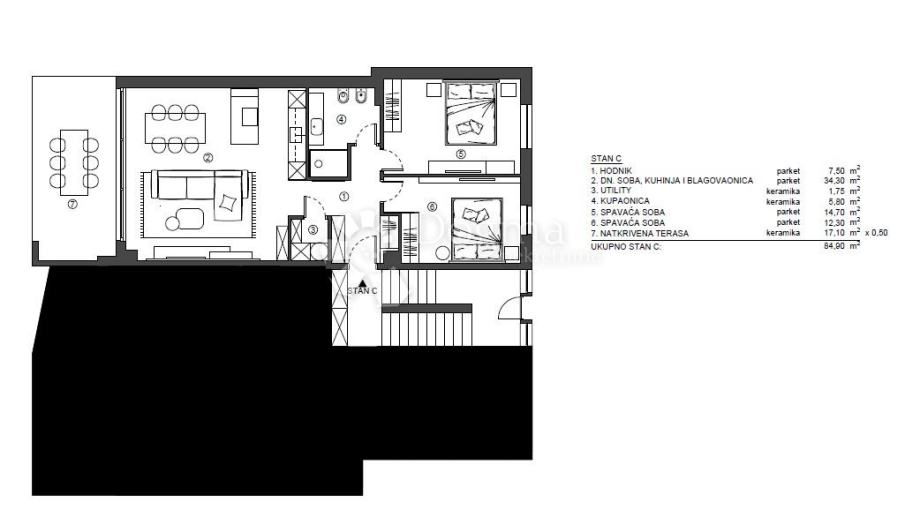 Stan se nalazi na drugom katu, a najveća prednost mu je prostrana natkrivena terasa 17,10m2 (8,55m2 NETO). Sastoji od ulaznog prostora, dvije spavaće sobe, spremišta, kupaone i prostranog dnevnog boravka s kuhinjom. Ispred ulaza u stan nalazi se ugradbeni ormar, pružajući dodatni prostor za pohranu.