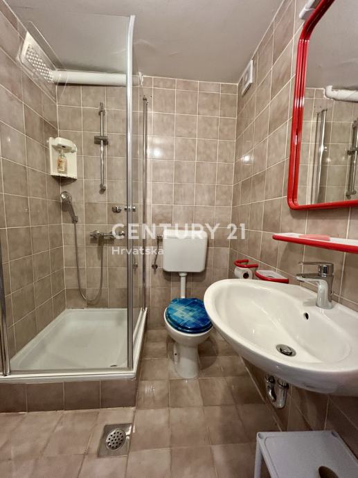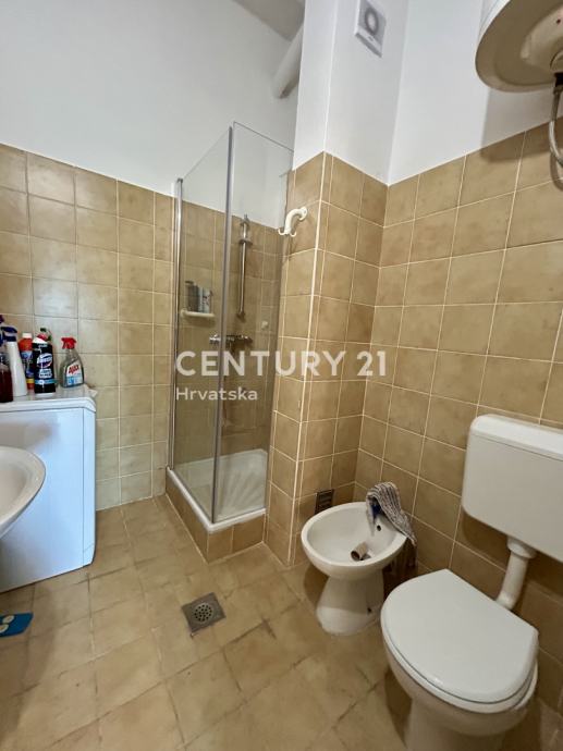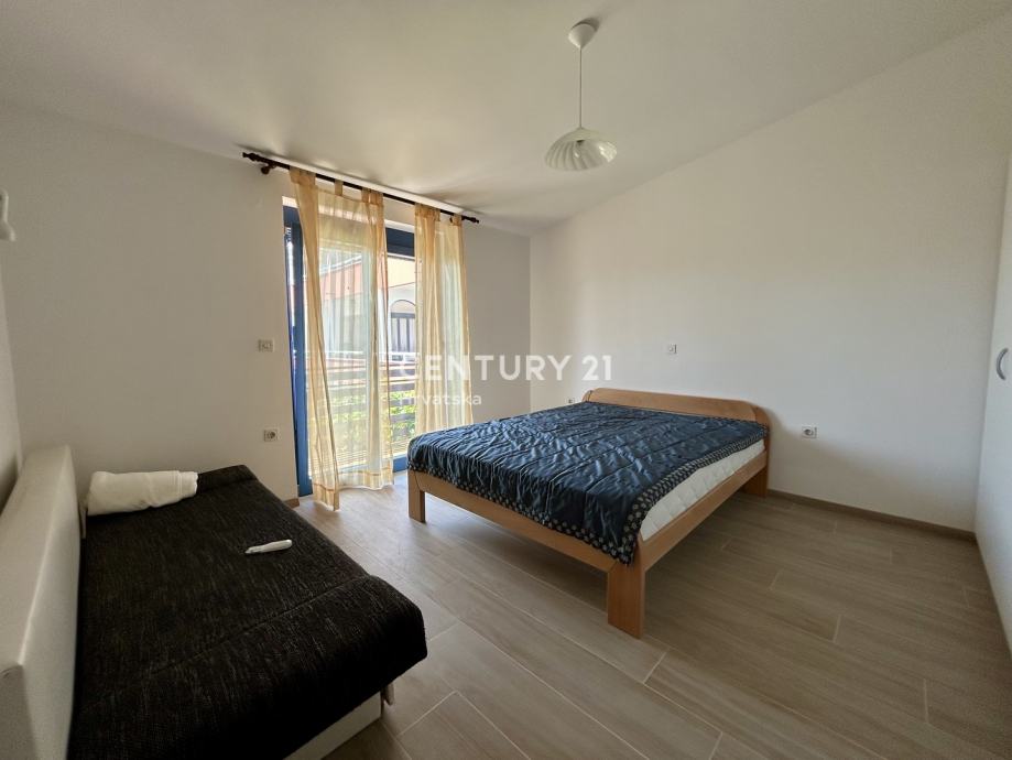 Vanjskim stepeništem penjemo se na prvi kat na kojem je smješten stan površine 70 m2 i sastoji se od ulaznog hodnika/komunikacije, kuhinje sa blagavaonom i dnevnim boravkom, dvije spavaće sobe, kupaonice i dvije prostarne i osunčane terase.