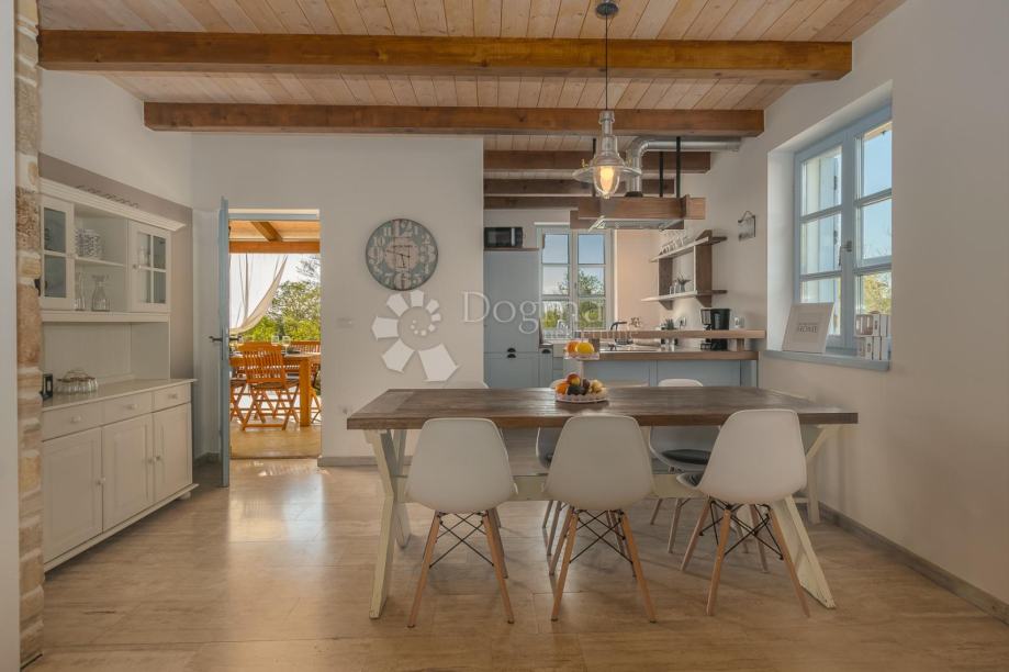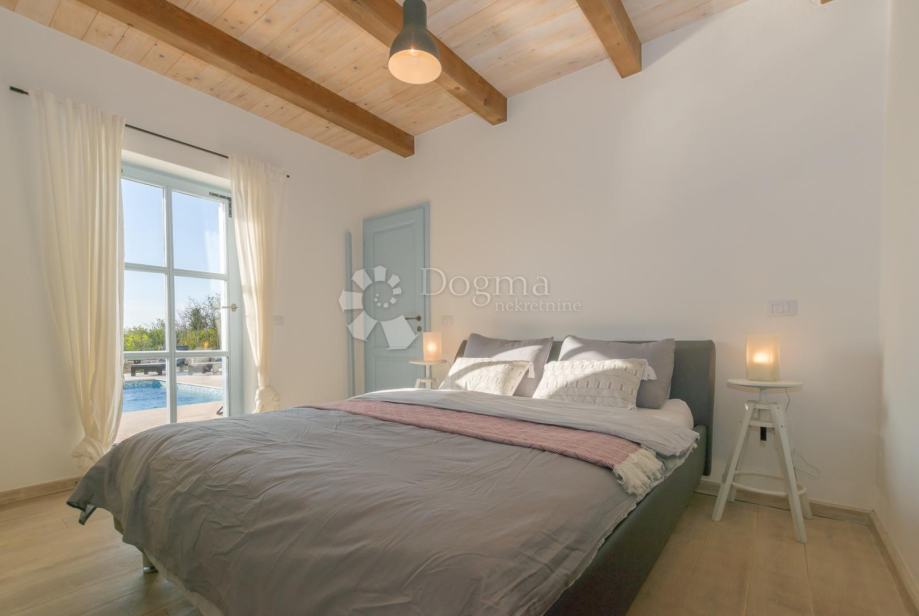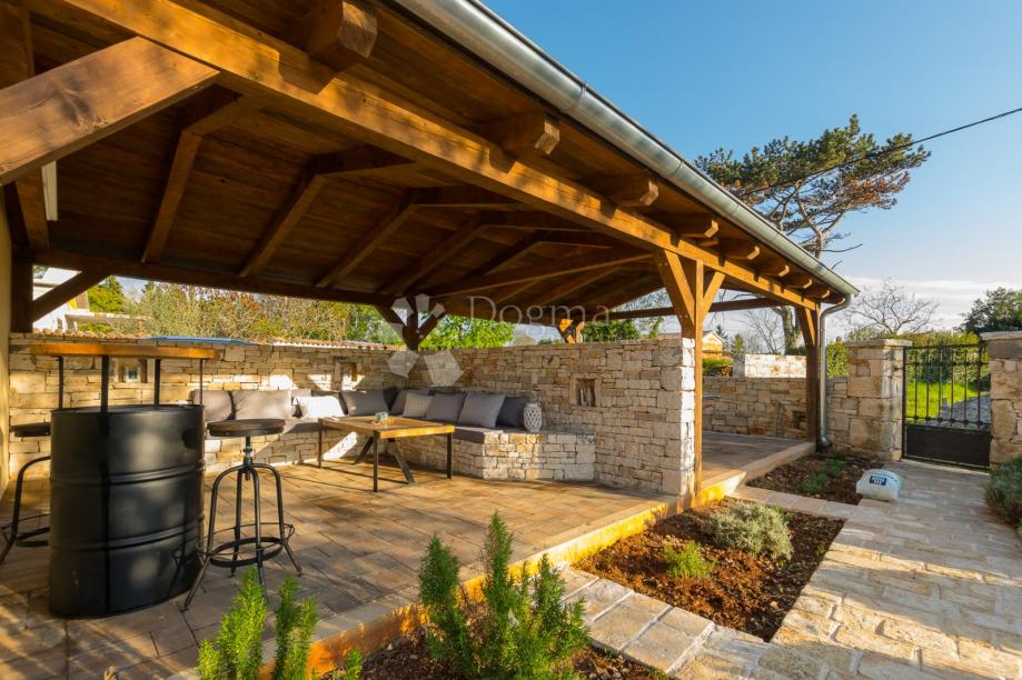 Eksterijer vile jednako je impresivan. U središtu okućnice nalazi se bazen sa sunčalištem, dok je natkrivena lounge zona savršena za uživanje u toplim ljetnim danima. Uređena i ograđena okućnica pruža sigurnost i privatnost, a dodatnu sigurnost osigurava sustav video nadzora. Grijanje je omogućeno putem kamina na drva i klima uređaja, što osigurava ugodnu temperaturu tijekom cijele godine.