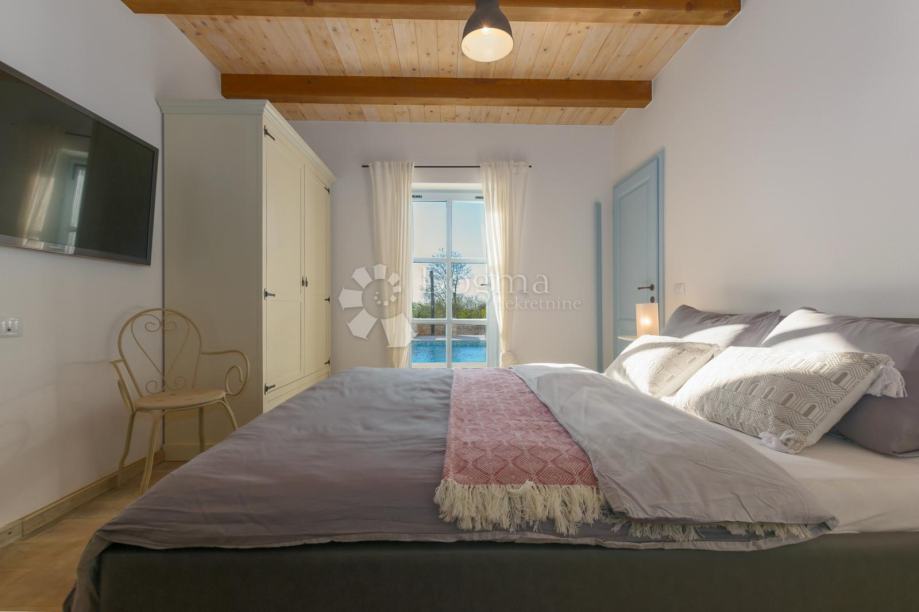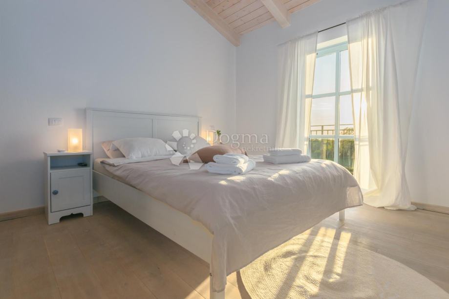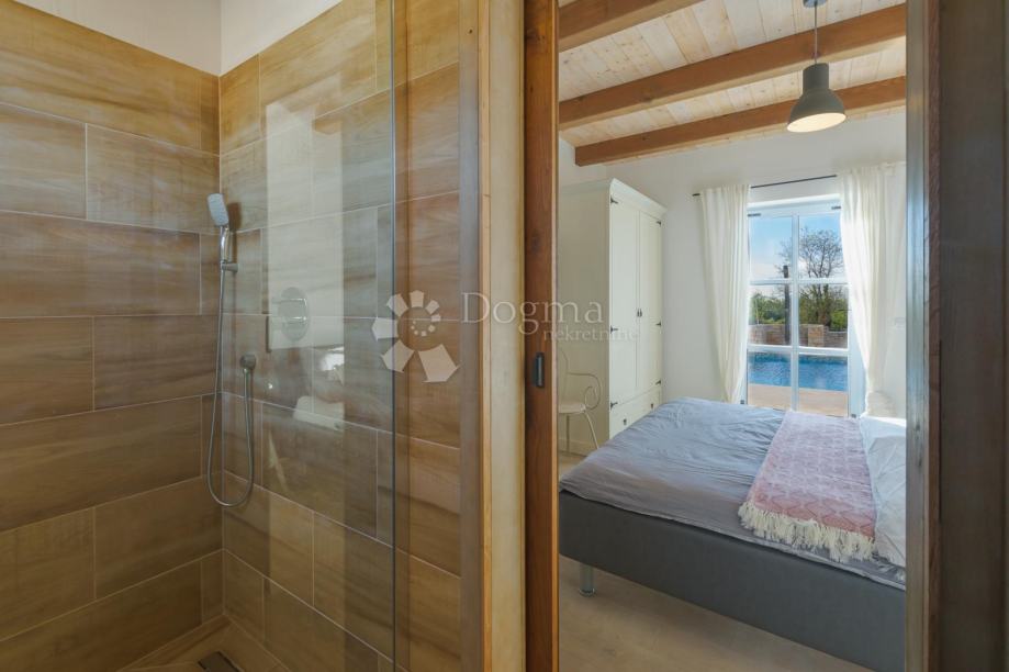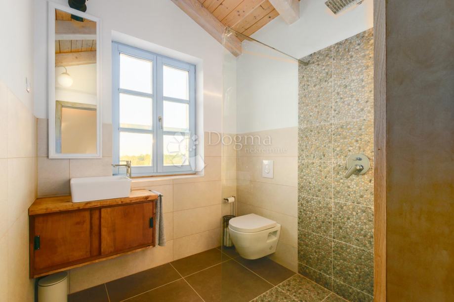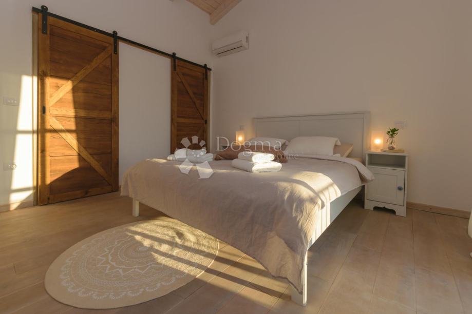 Na katu su smještene tri spavaće sobe, svaka sa svojom kupaonicom, čime je osigurana razina udobnosti usporediva s hotelom visoke kategorije. Izlaz na balkone otkriva smirujući pogled na istarske pašnjake i prirodu, stvarajući savršeno okruženje za jutarnju kavu ili večernje opuštanje.