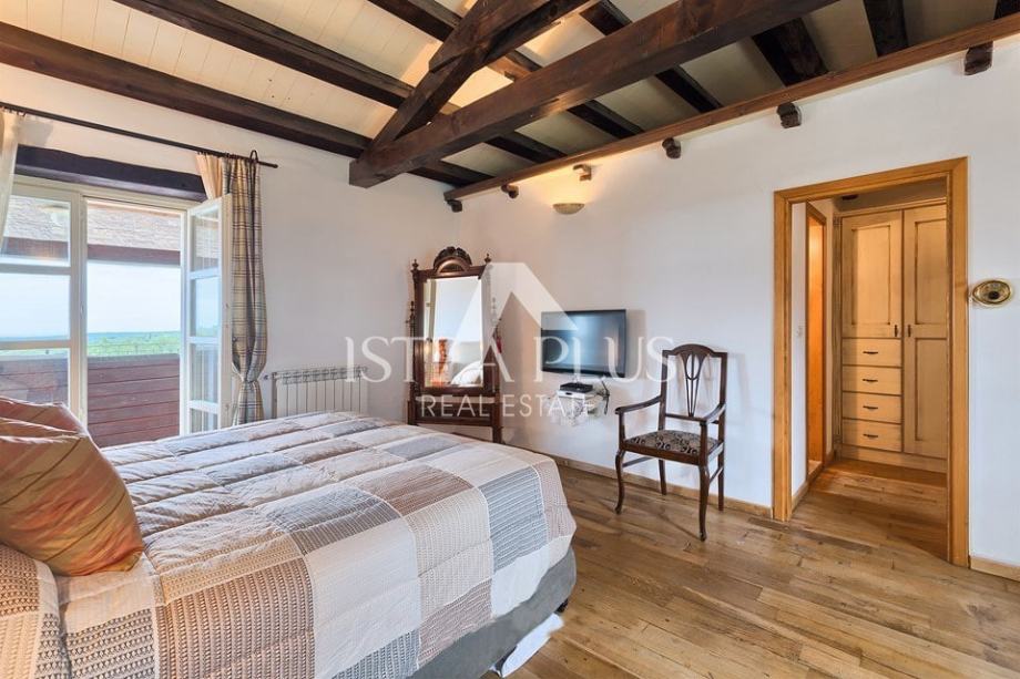 Na katu su 3 dvokrevetne sobe sa pripadajućim kupaonama i garderobama. S gornjeg kata izlazi se na natkrivenu terasu smještenu na zapadnoj strani, gdje navečer možete uživati uz pogled na more i zalazak sunca, te privatnost i tišinu koju pruža priroda. Vila se smatra jednom od najljepših u Istri te je objavljena u mnogim časopisima za interijere.