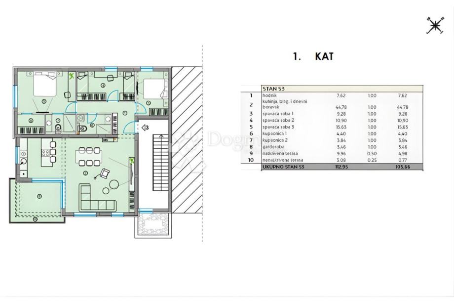 Sveukupna neto stambena površina iznosi 112,95 m2, a sačinjena je od: