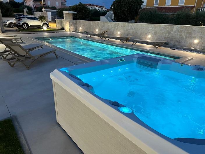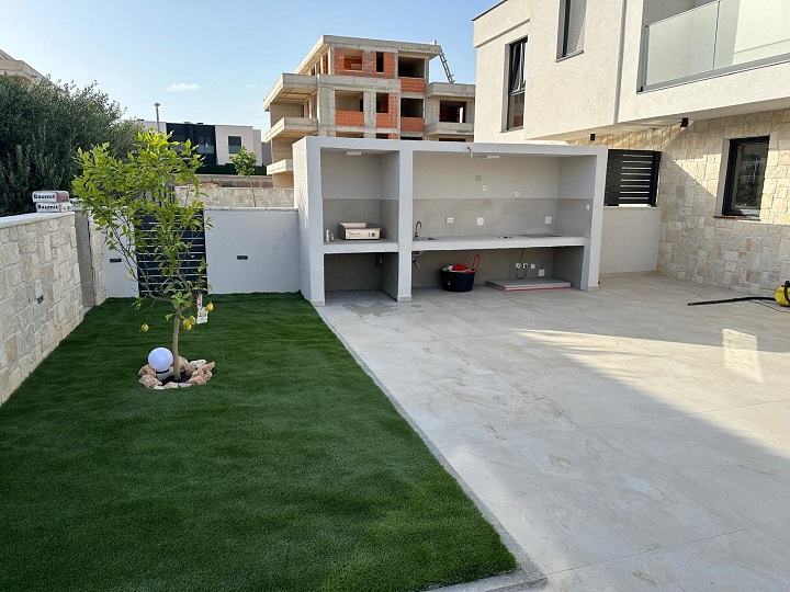Uređeno dvorište. Bazen sa dizalicom topline i svom automatikom, obložen keramičkim pločicama, ljetna kuhinja sa roštiljem, sudoperom, indukcijskim krugovima i radnim pločama, pergola sa cca 20čm, tuš solarni vani, jacuzzi, vanjska ambijentalna rasvjeta.
