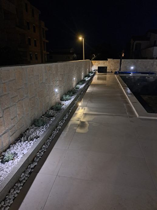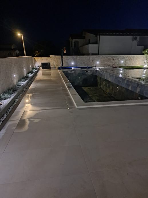 Uređeno dvorište. Bazen sa dizalicom topline i svom automatikom, obložen keramičkim pločicama, ljetna kuhinja sa roštiljem, sudoperom, indukcijskim krugovima i radnim pločama, pergola sa cca 20čm, tuš solarni vani, jacuzzi, vanjska ambijentalna rasvjeta.