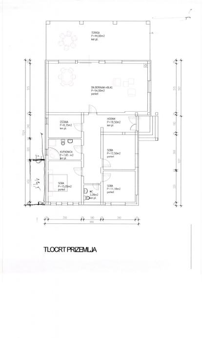 Vila se sastoji od: tri sobe kvadrature 12+13+15 m2, velika kupaonica 9 m2, ostava 8 m2, posebni sanitarni čvor 4 m2, dnevni boravak sa blagovaonicom i kuhinjom 54 m2, hodnik 20 m2 terasa 44 m2 i vanjska ostava 14 m2.