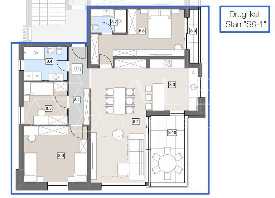 Sastoji se od kuhinje, blagovaonice i dnevnog boravka otvorenog koncepta, hodnika,dvije kupaonice, tri spavaće sobe te natkrivene i nenatkrivene terase.