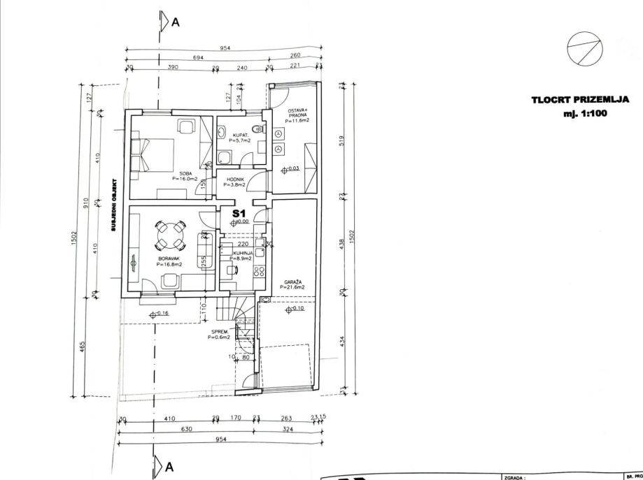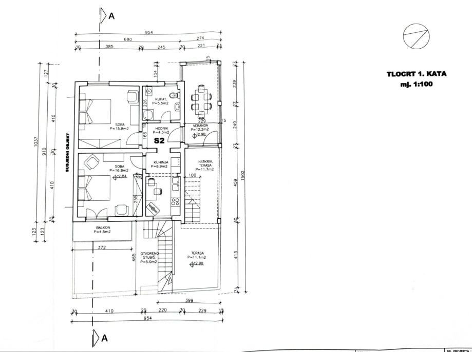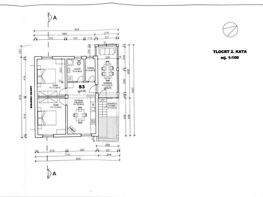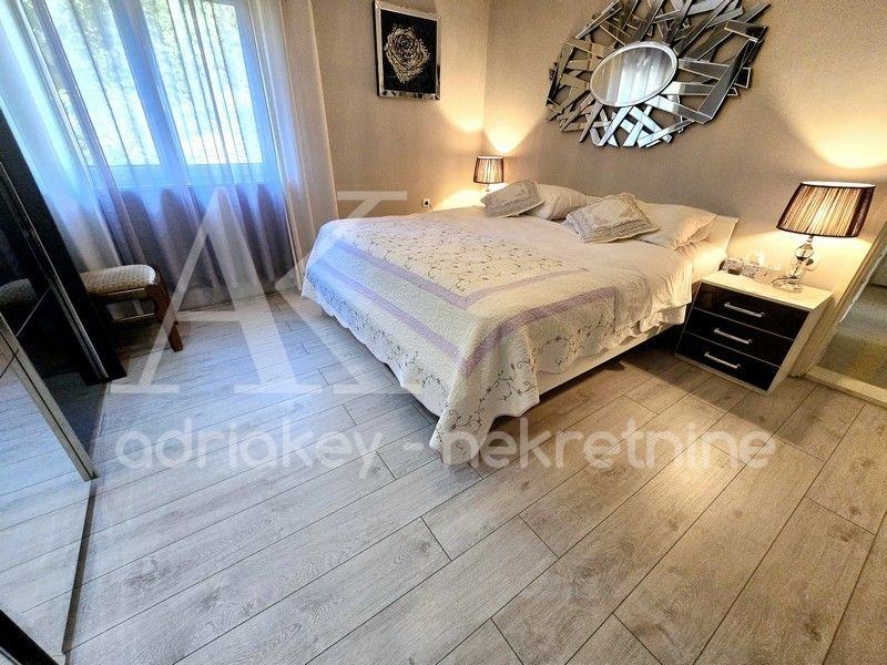 Kuća je ukupne stambene površine od 278 m2 raspoređenih na prizemlje i dva kata. U prizemlju se nalazi prostrana garaža koja ima ulaz u stambeni dio objekta, vanjska terasa, dnevni boravak, odvojena kuhinja s blagovaonicom, spavaća soba, kupaonica, prostrana ostava u kojoj je smještena praonica rublja s izlazom na zapadnu terasu.Na prvom katu do kojeg vodi zasebno vanjsko stepenište se nalazi dvosoban apartman kojem pripada terasa, unutarnja zatvorena terasa, kuhinja s blagovaonicom, dvije prostrane spavaće sobe od kojih istočnoj pripada manji balkon, kupaonica, te manja ostava. Na drugom katu sa zasebnim ulazom se također nalazi dvosoban stan koji se sastoji od zatvorene terase, kuhinje s blagovaonicom, dvije spavaće sobe i kupaonice.