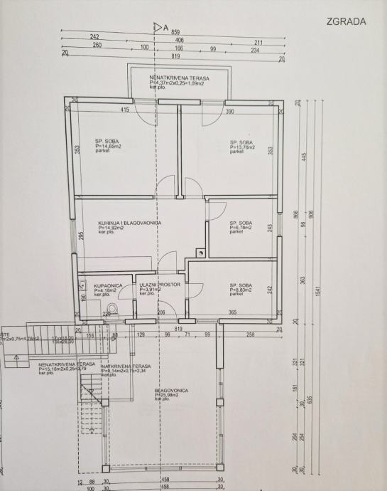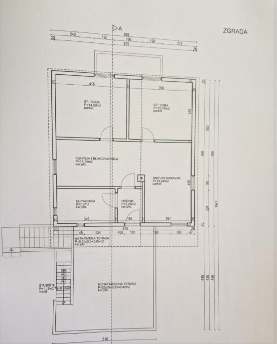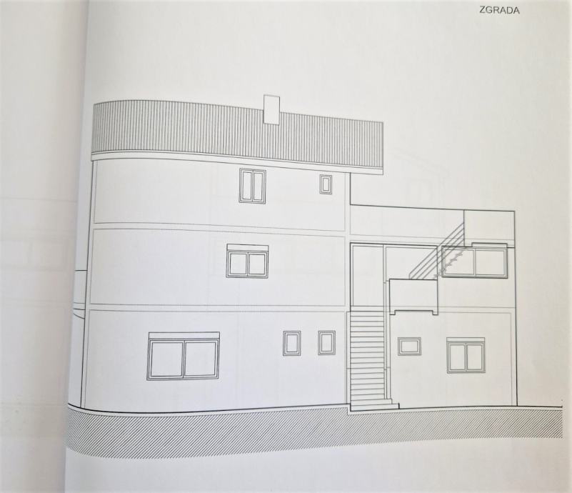 Na kat se dolazi vanjskim stepeništem gdje se nalazi prostrani četverosoban stan, a sastoji se od ostakljene sunčane verande koja služi kao blagovaonica, predsoblje, 4 spavaće sobe, kuhinje i kupaonice.