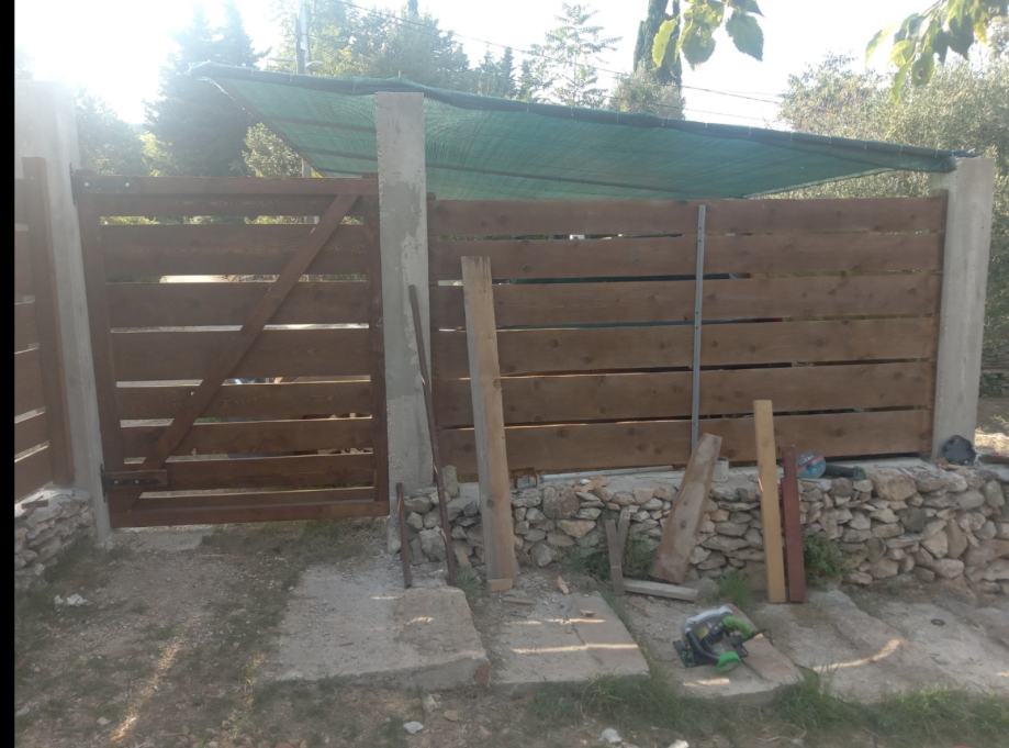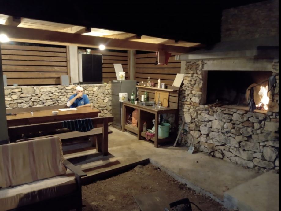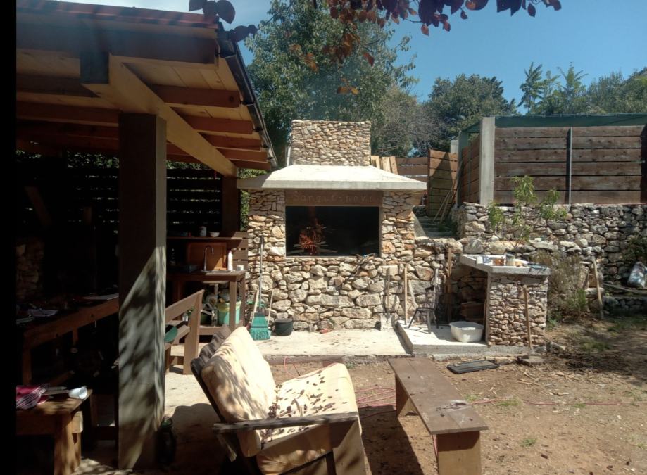 Ima natkriveni parking za tri vozila, sjenicu od dvadesetak kvadrata i rustikalni kingsize komin integriran u suhozid.