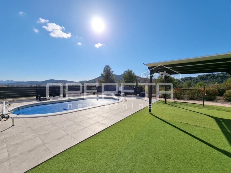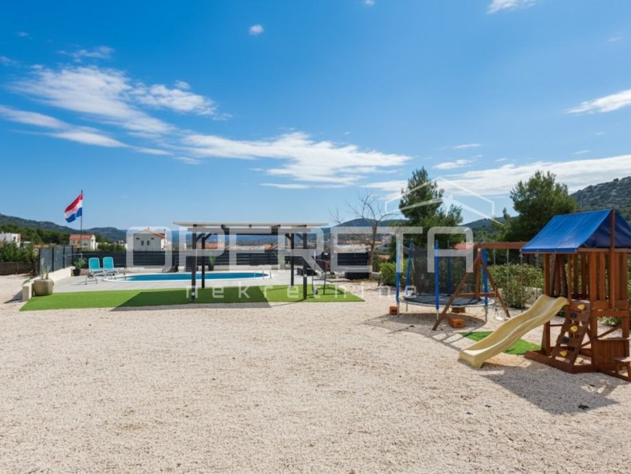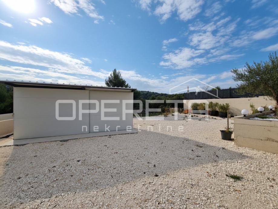 Zemljište je projektirano na dvije kaskadne razine, funkcionalno i vizualno odvojene modernim potpornim zidovima i ogradom. Donji dio parcele sadrži prostranu i praktičnu kontejner-garažu, idealnu za smještaj vozila, brodice ili dodatnog skladišnog prostora. Na gornjem dijelu parcele smjestio se bazen sa sunčalištem, natkrivena terasa te dječje igralište, sve okruženo mediteranskim biljem i oplemenjeno dekorativnim šljunkom.
