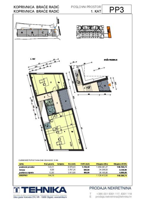 PP3 uredski poslovni prostor s s pripadajućim parkirnim mjestom, ukupne je površine od 144,19 m2 od čega sami poslovni prostor 123,11 m2, terasa 9,08 m2 i pripadajuće parkirno mjesto površine 12,00 m2.