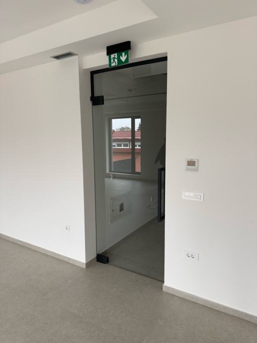 Uredski prostor od 50 m² smješten je u novoj poslovnoj zgradi u centru Osijeka, u četvrti Gornji grad. Zgrada je izgrađena 2025. godine i nosi energetski razred A+, a prostor se nalazi unutar zgrade s liftom. Unutarnje uređenje oslanja se na velike staklene stijene koje omogućuju svjetlost koji u tri prostorije, dok hodnik i otvorene površine ostaju vizualno povezani.