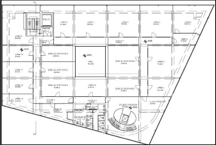Uredski prostor površine cca. 1.140,26 m² prostire se preko cijelog drugog kata. Sastoji se od ulaznog prostora s recepcijom, devetnaest uredskih prostorija, čajne kuhinje s prostorom za blagovanje te muških i ženskih sanitarnih čvorova. Prostor raspolaže s nekoliko izlaza u atrij koji osigurava dovoljno dnevnog svijetla u centralnim prostorijama, a može poslužiti i kao prostor za odmor. Prostoru pripada 35 vanjskih parkirnih mjesta.