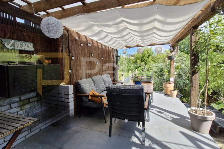 Prizemlje: dnevni boravak, kuhinja s blagovaonicom (izlaz na natkrivenu terasu i dvorište sa zidanim roštiljem), kupaonica, manja soba