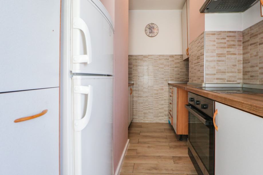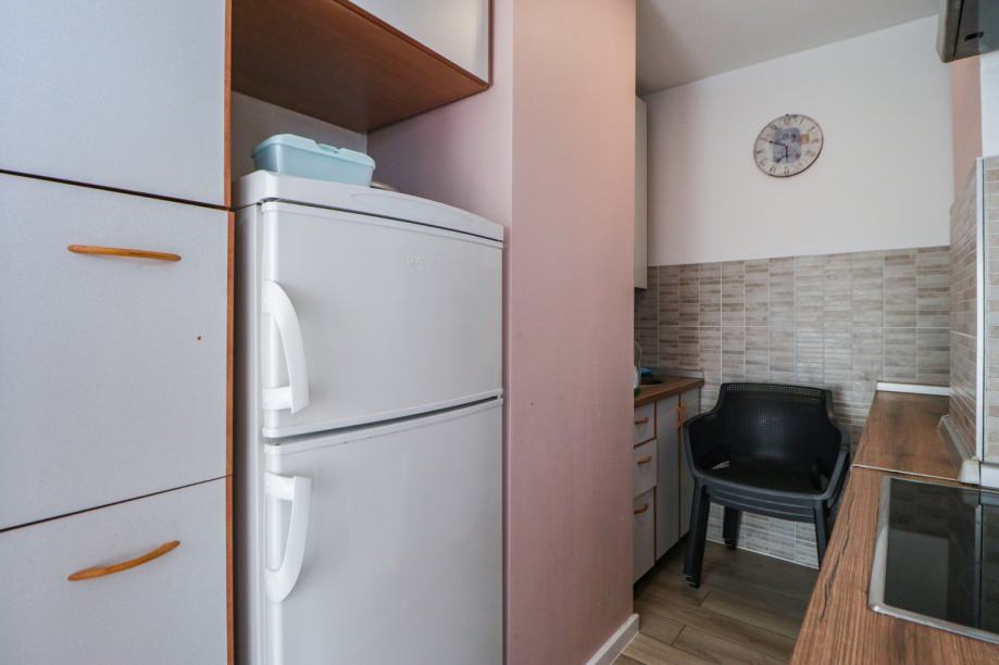 Sastoji se od hodnika, ostave, kupaonice, zasebnog toaleta, kuhinje, dnevnog boravka i spavaće sobe. Izlazak na terasu je iz dnevnog boravka i kuhinje. Stan je gotovo kompletno renoviran i potpuno namješten, a opremljen je klima uređajem, perilicom rublja, hladnjakom sa zamrzivačem, pećnicom, kuhinjskom pločom i sl.