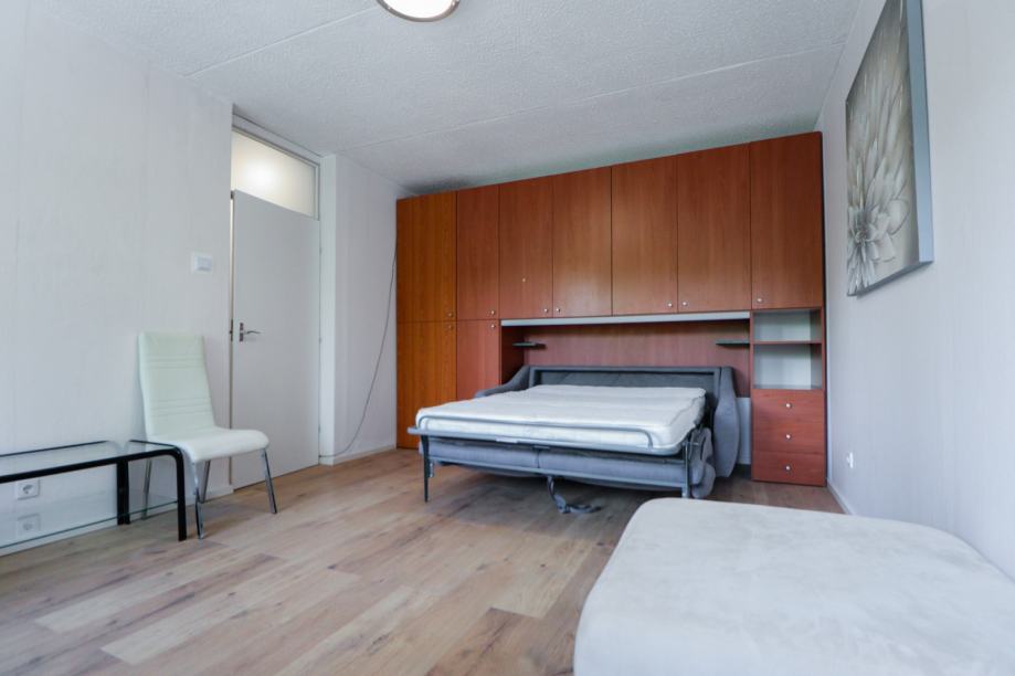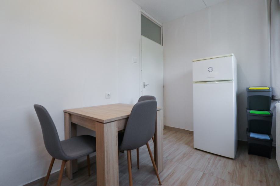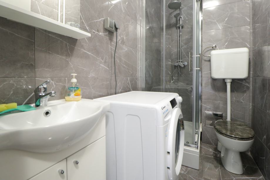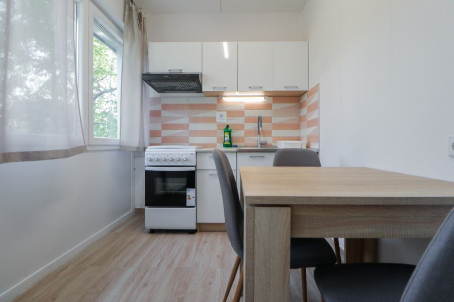 Stan je renoviran 2025. godine (novi zidovi, podovi, kuhinja, kupaonica). Orijentiran je na jugozapad stoga je svjetao i topao. Površine je 32 m2, a sastoji se od ulaznog hodnika, dnevnog boravka s kaučom/krevetom na izvlačenje, kuhinje s blagovaonicom te kupaonice s tuš kabinom i toaletom. U dnevnom boravku je moguće staviti i još jedan krevet prema potrebi.