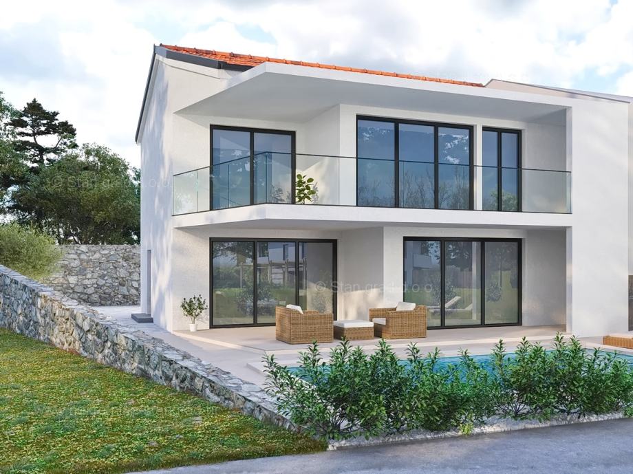 Iz ponude odličnih nekretnina kod naše agencije na sjevernom Jadranu ističe se moderna kuća sagrađena na području tražene hrvatske i kvarnerske obalne regije otok Krk. Ova privlačna nekretnina se nalazi na izvanrednoj lokaciji u Uvali Soline u neposrednoj blizini mora. Strukturno, ovo je dvojna kuća katnica. Suvremeno građena kuća se sastoji od prostora raspoređenog na ukupno 2 etaže. Površina ove kuće iznosi ukupno 175 m2. U toj su površini obuhvaćeni ulazni hodnik, spremište, kupaonica, kuhinja s blagovaonicom i dnevni boravak s izlazom na natkrivenu terasu i okućnicu u prizemlju. Na katu se nalaze tri kupaonice i 3 spavaće sobe te dnevni boravak od kojih dvije spavaće sobe i dnevni boravak imaju izlaz na natkrivenu terasu s koje se pruža pogled na more. U okviru vlasništva opisane nekretnine sadržana je i lijepo izvedena okućnica kojoj posebnu draž i vrijednost donosi bazen, uređeni prostor za opuštanje i ljetna kuhinja. Na okućnici opisane nekretnine mogu se komforno parkirati dva automobila. Uz prethodno, važno je napomenuti da kuća ima vrlo lijep otvoreni pogled na more. Nekretnina je trenutno u izgradnji, a planirani završetak radova očekuje se sredinom 2025. Predmetna je kuća u vlasništvu fizičke obveze i kod prijenosa vlasništva podliježe obračunu poreza na promet nekretnina u visini 3%. Prodavatelj nekretnine garantira brz prijenos vlasničkih prava te urednu vlasničku i tehničku dokumentaciju. Posjetite nas na otoku Krku i uvjerite se da nam je vaše zadovoljstvo prioritet. Kupcu ove nekretnine će prodajni tim agencije Stan Grad Immobilien rado pomoći kod prijenosa vlasništva nekretnine u zemljišnu knjigu te prijenosa računa za struju, vodu i odvoz smeća na svoje ime.