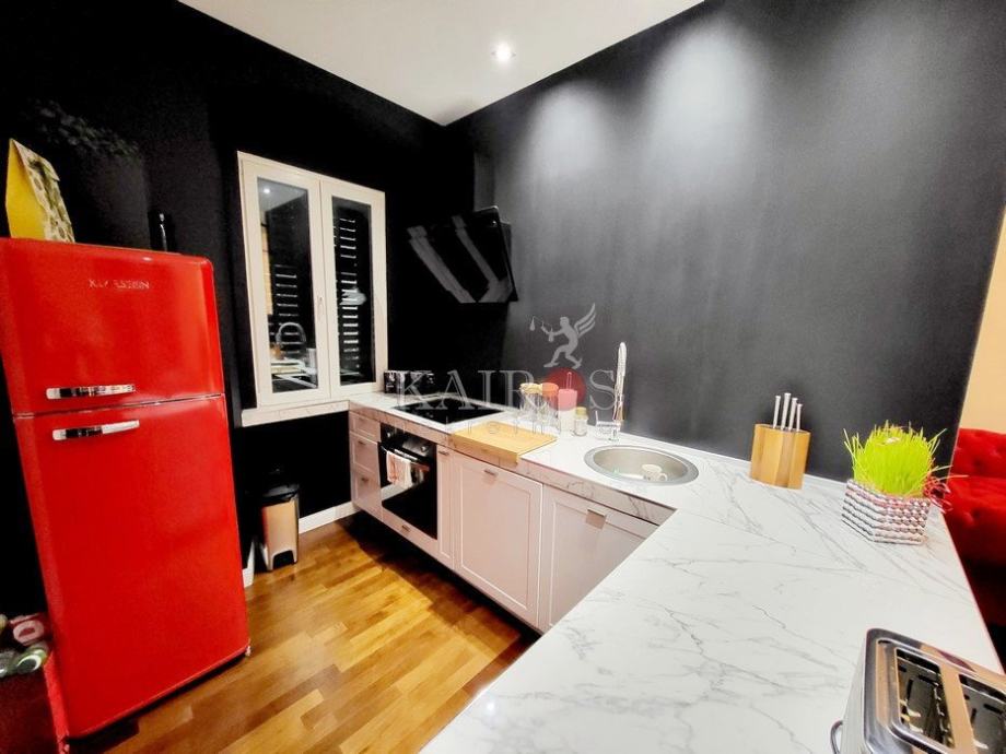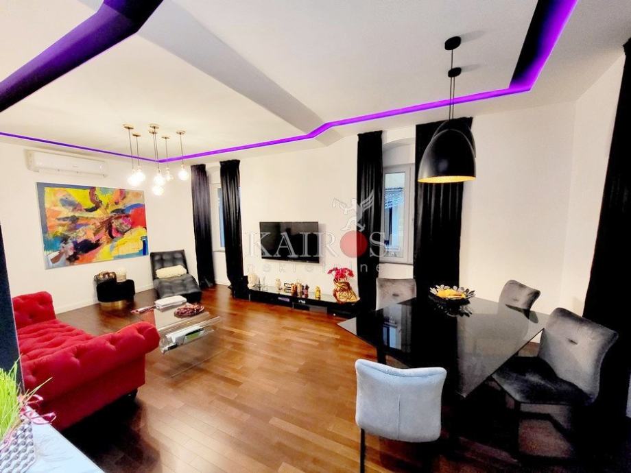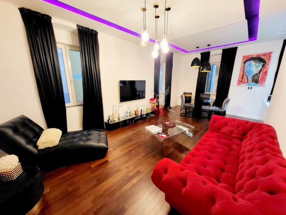 U užem centru Rijeke, stan površine 78.50 m2, dvosoban s dnevnim boravkom, na 1. katu stambene zgrade. Stan je novouređen, ekstravagantnog dizajna. Ima izlaz na terasu površine 30 m2. Odlično opremljen, etažno centralno grijanje, dvije kupaonice s podnim grijanjem.