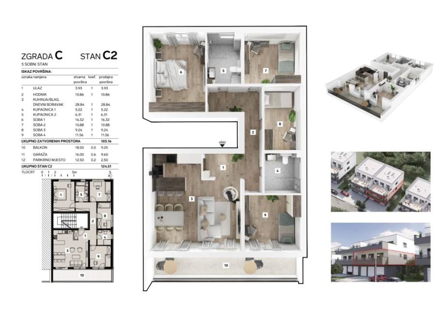 Petorosoban stan oznake C-2 na 1.katu zgrade sa 3 stana, u izgradnji, u naselju Rakarje, pored Velike Gorice. Sastoji se od: ulaznog hodnika dnevnog boravka s kuhinjom i blagovaonicom, 4 spavaće sobe, hodnika, 2 kupaonice, balkona, garaže i vanjskog parkirnog mjesta. Rok useljenja je 06.2025.g. Zgrada se gradi od termo blok opeke 25 cm sa armirano-betonskom kontrukcijom, a pregradni zidovi od cigle. Zgrada će biti biti obložena kamenom vunom, debljine 10 cm, a predviđen energetski razred je "A". Svi stanovi imat će svoje vlastite priključke, a grijanje je podno na plin. Podovi dnevnog boravka, kupaone i kuhinje bit će obloženi kvalitetnom keramikom po želji kupca, dok će u sobama biti ugrađen parket. Stolarija je PVC - Komerling MD 76, troslojna, u antracit boji sa aluminijskim roletama. Stubište zgrade bit će obloženo kamenom, stubišna ograda od inoxa, a na stropu bit će ugrađen svjetlarnik.