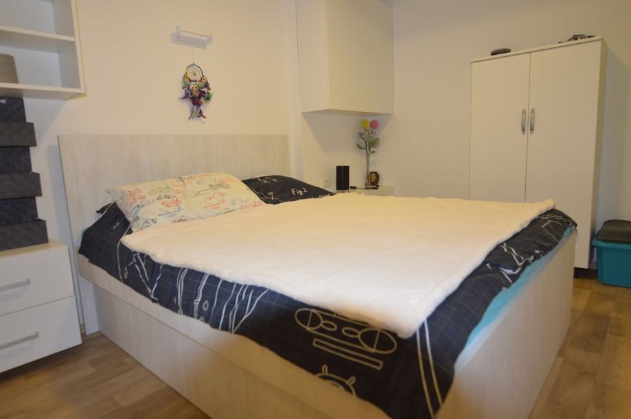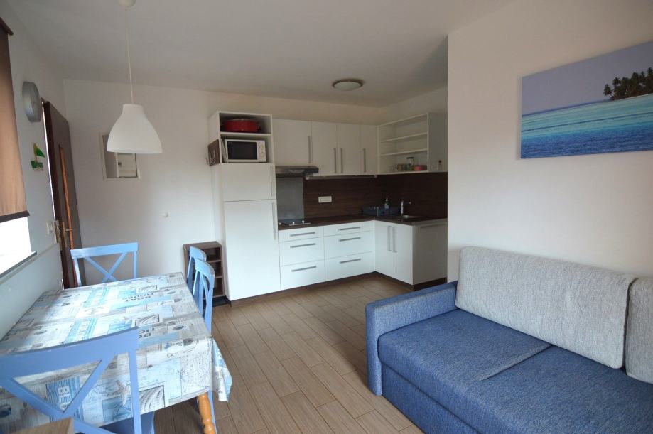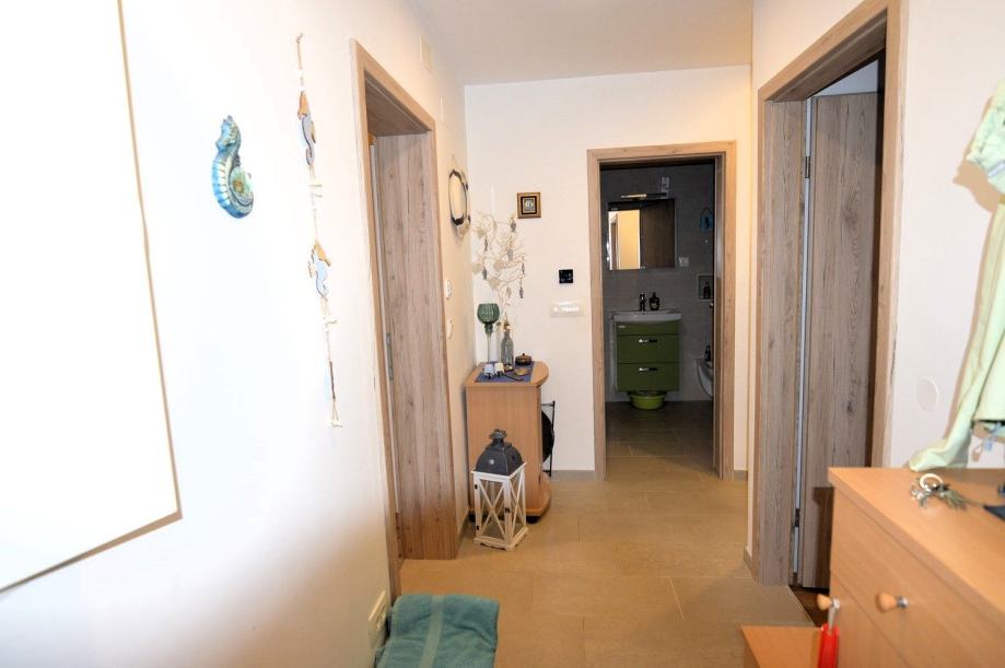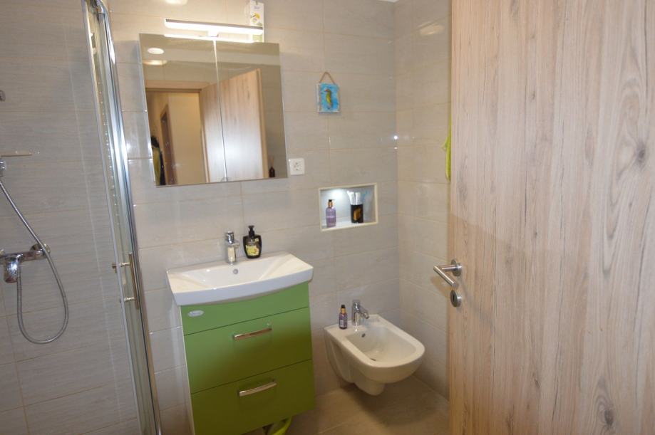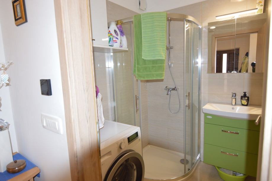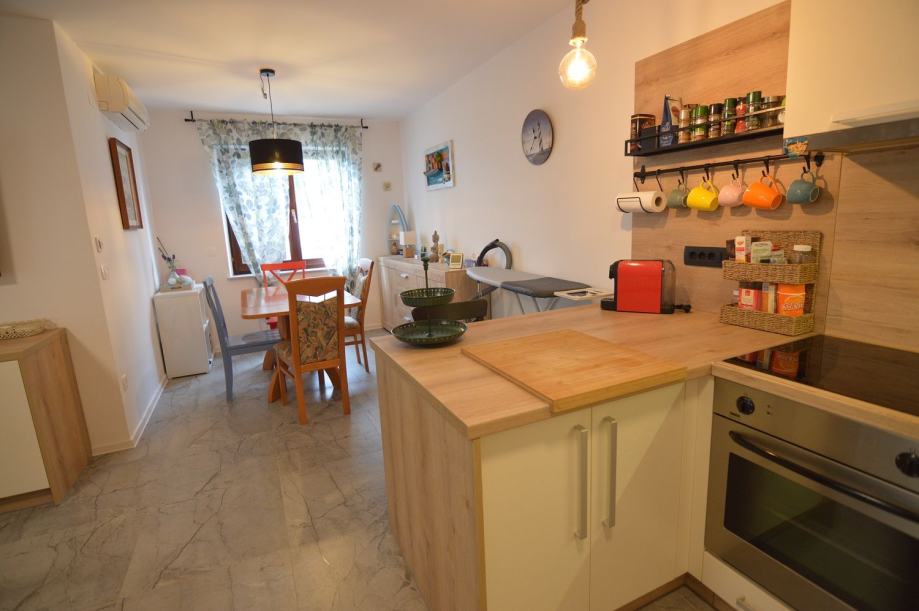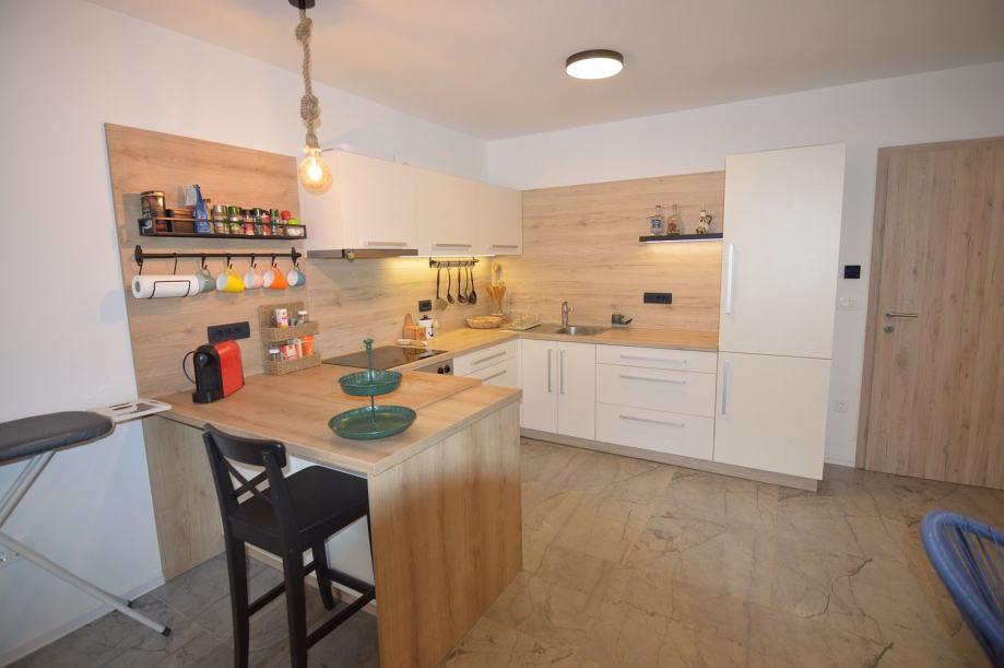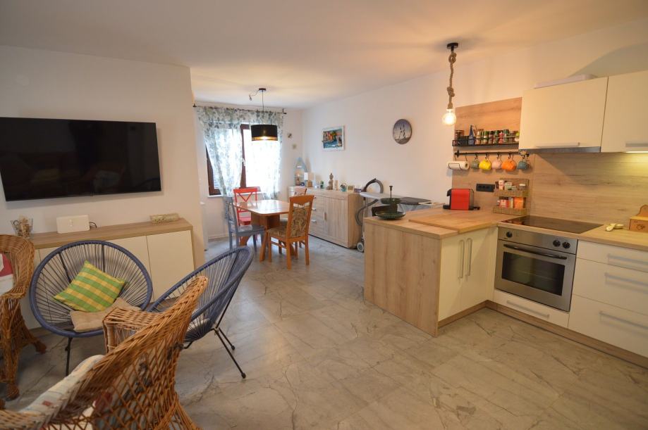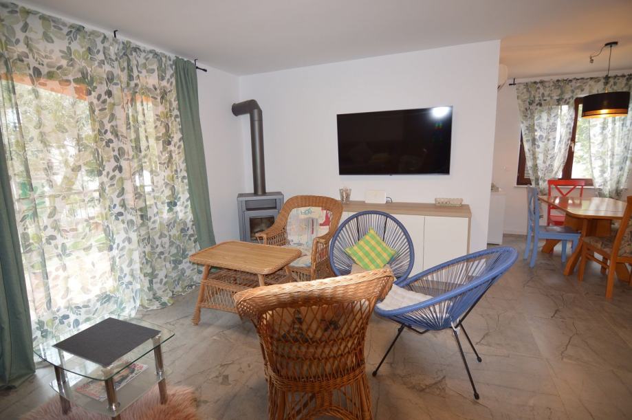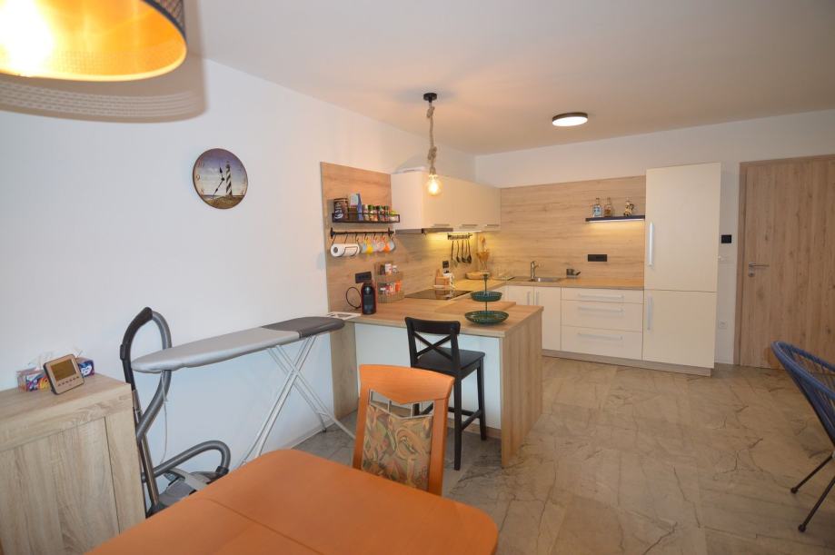 U prizemlje kuće je smješten stan od neto 69.11 m2 koji se sastoji od predsoblja, kuhinje sa blagovaonom i dnevnog boravka, dvije spavaće sobe, kupatila i terase sa izlazom na vrt , gdje se nalazi roštilj. Stan ima električno podno grijanje, peć na drva i klima uređaj za grijanje i hlađenje.