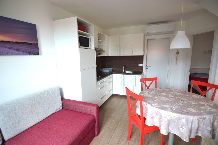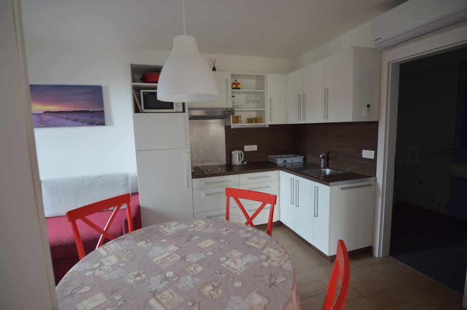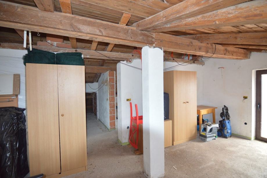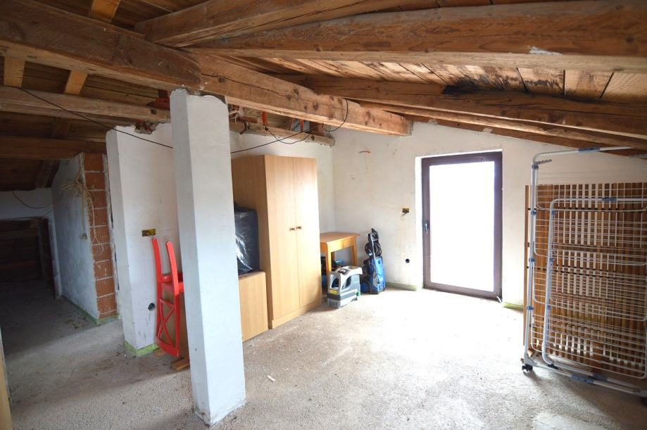 Potkrovlje kuće od neto 24.20 m2 je neuređeno , moguće ga je urediti u apartman , a sastoji se od kuhinje sa blagovaonom i dnevnog boravka , kupatila, spavaće sobe i terase sa predivnim pogledom na more.