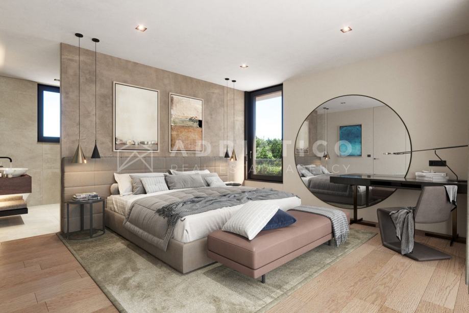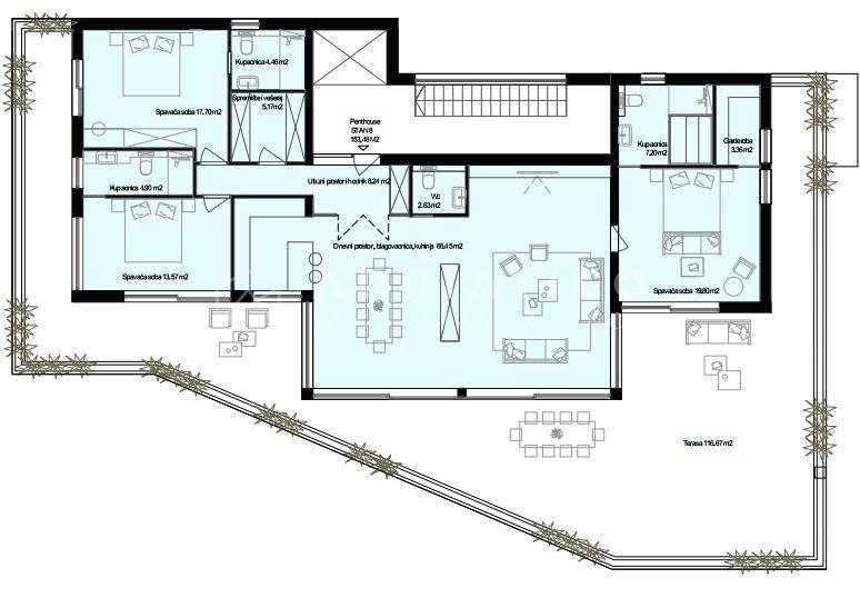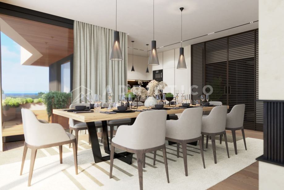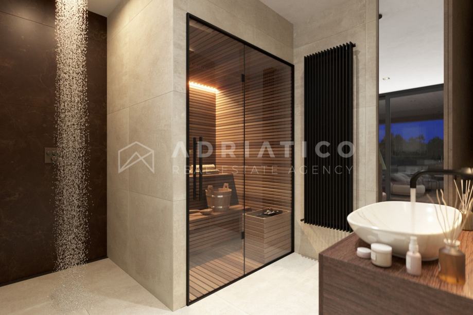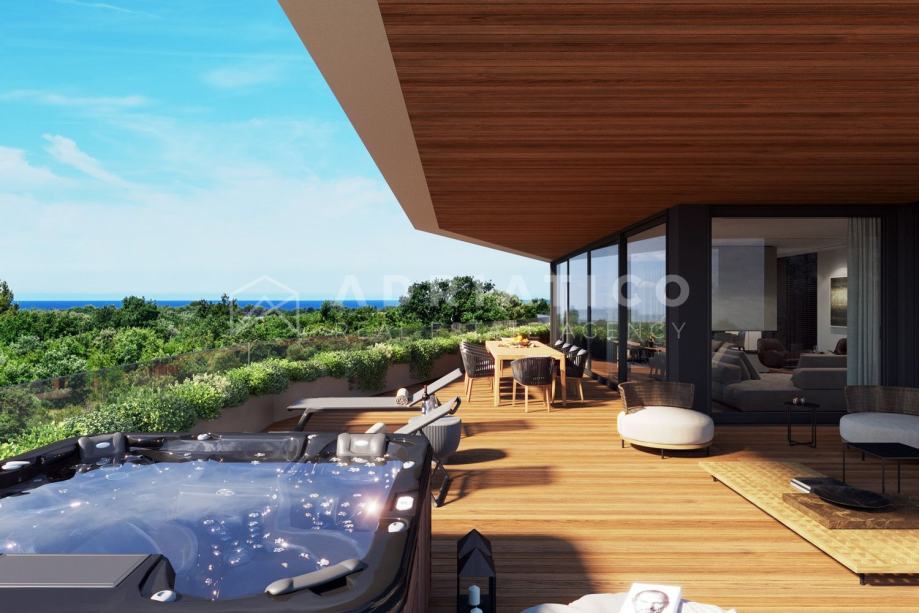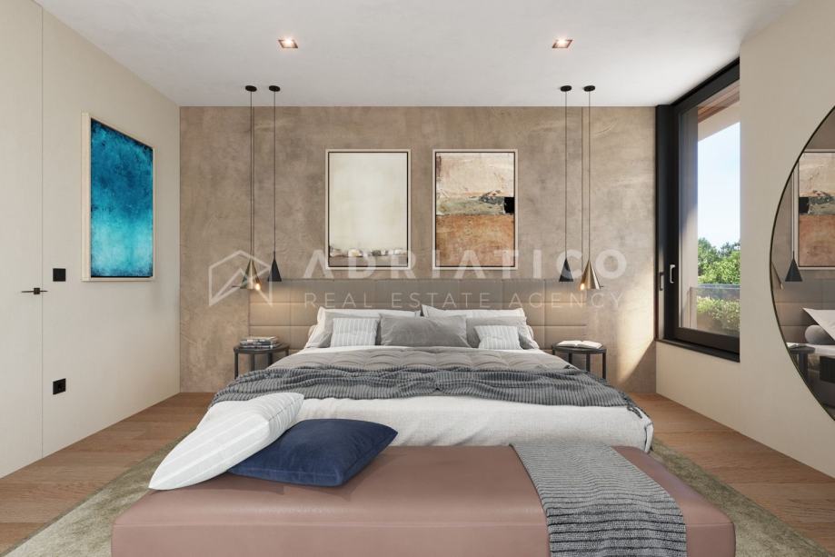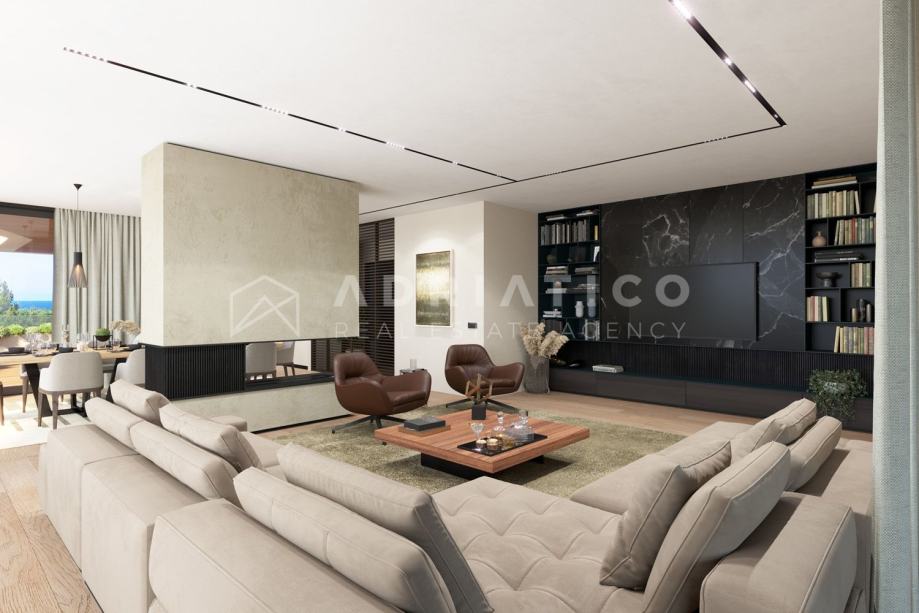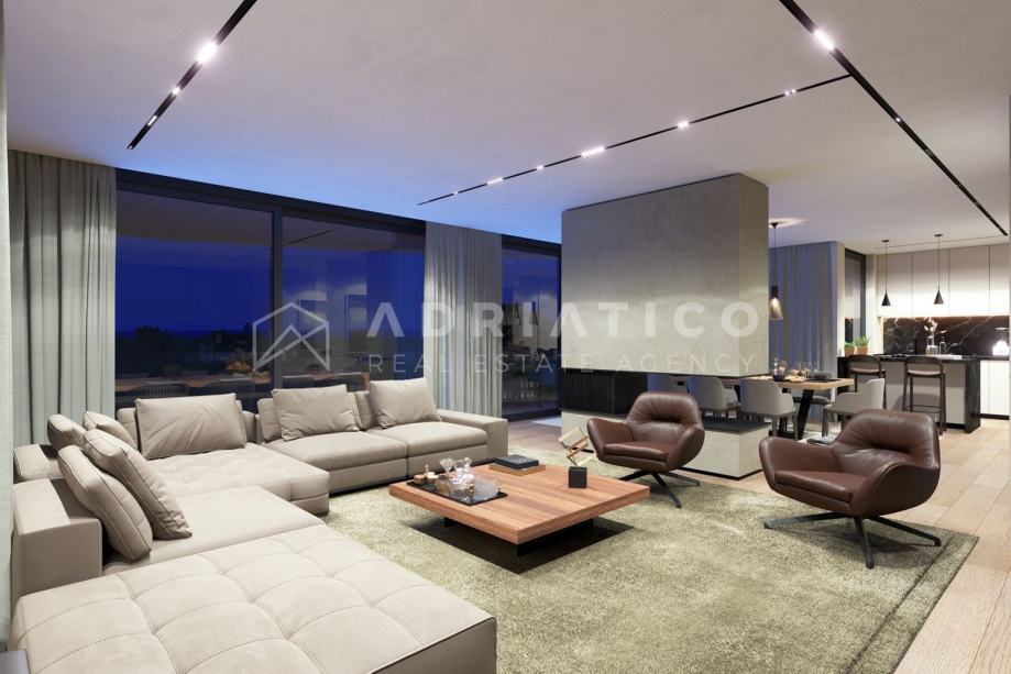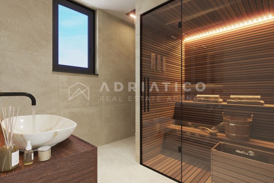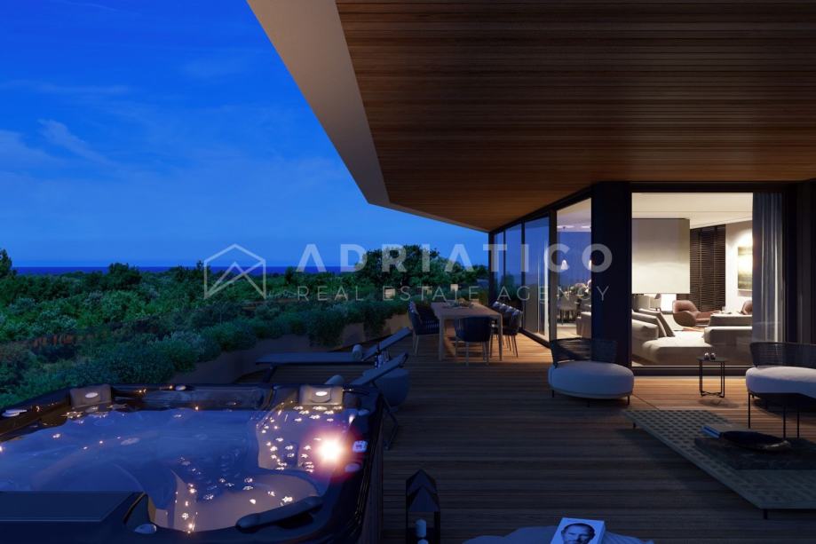 Penthouse se sastoji od 3 master spavaće sobe te kuhinje, blagovaonice i dnevnog boravka otvorenog koncepta. Iz svake prostorije se izlazi na velebnu terasu koja okružuje cijeli stan s koje se pruža nevjerojatan panoramski pogled na more i zelenilo.