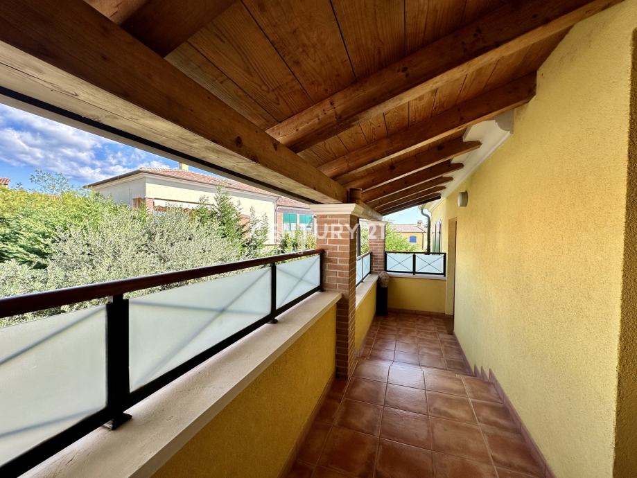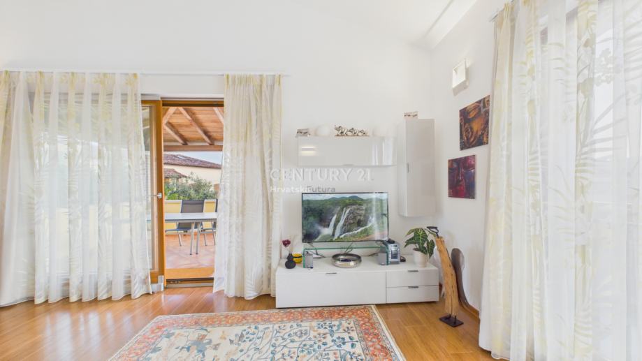 Veći stan sastoji se od predsoblja, kupaonice, kuhinje s blagovaonom i dnevnog boravka s izlazom na prostranu natkrivenu terasu, idealnu za uživanje u vanjskom prostoru tijekom cijele godine.