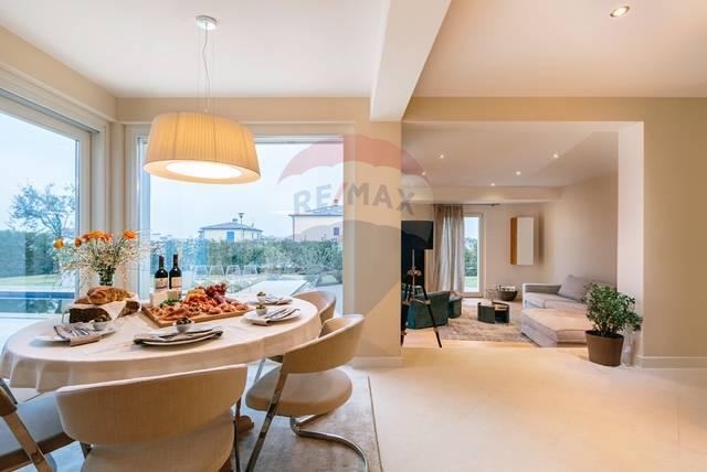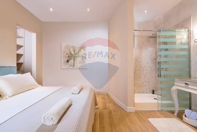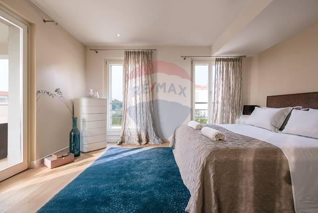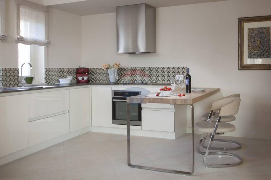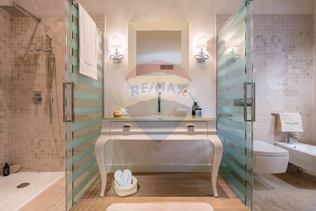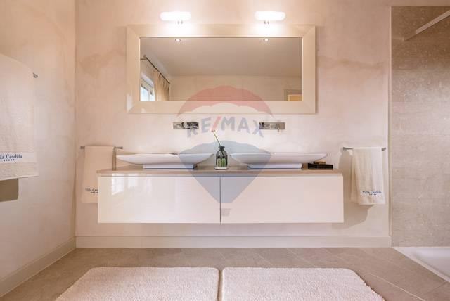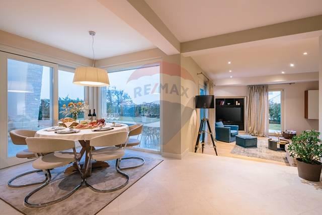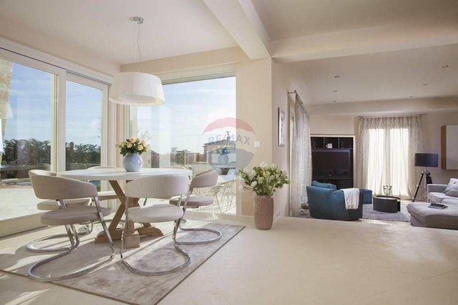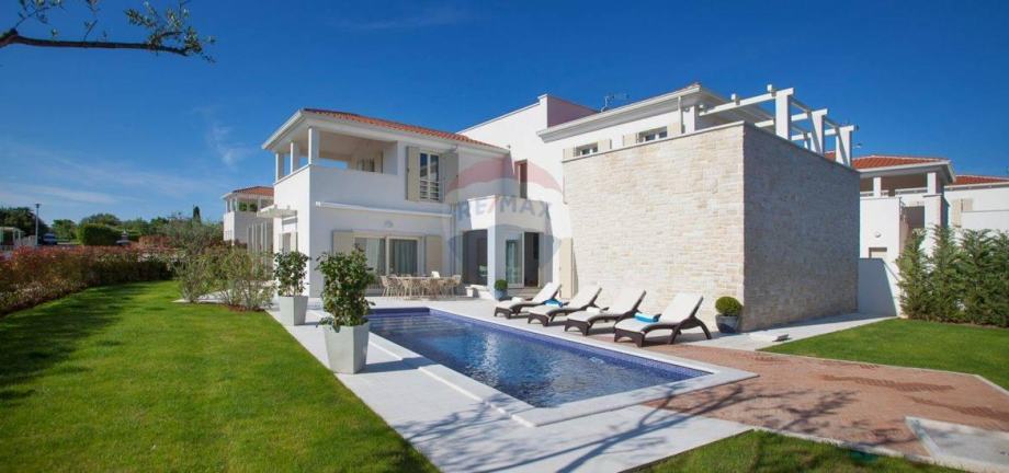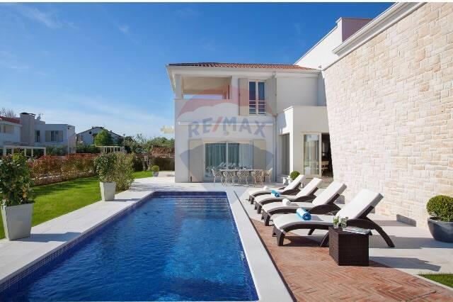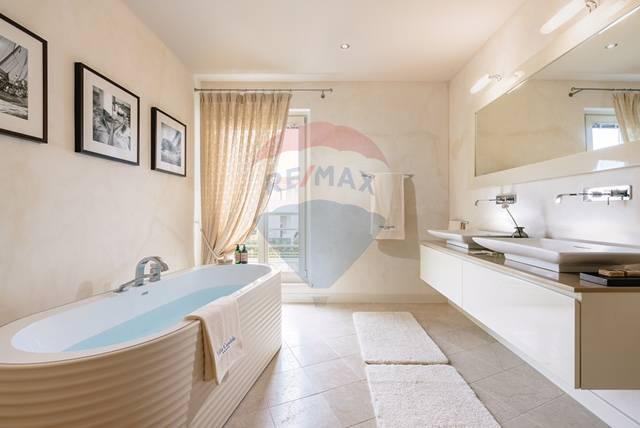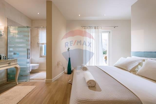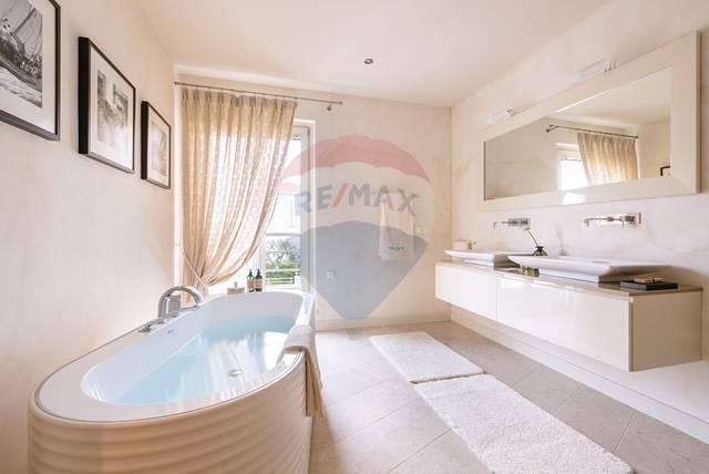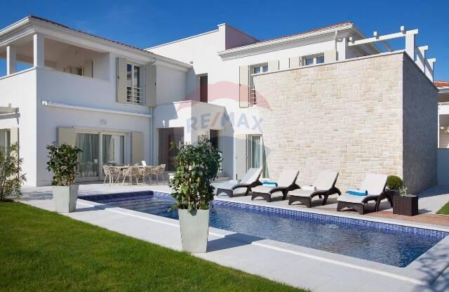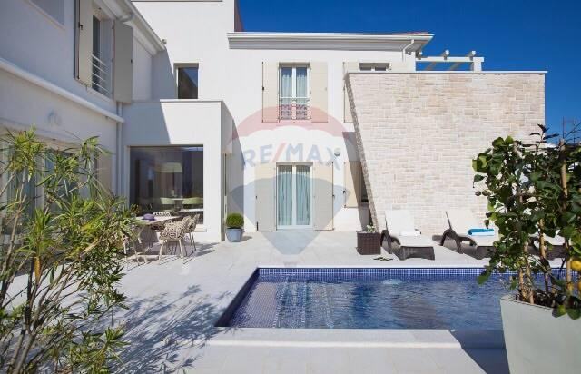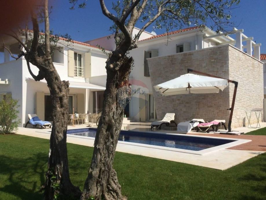 U neposrednoj blizini mora, okupana zelenilom, zadivljujućeg otvorenog pogleda, smjestila se ova jedinstvena elegantna ljepotica. Vila je savršen spoj mediteranske arhitekture, bijeli se kamen uklapa u neodoljiv vanjski izgled vile te se savršeno nadovezuje sa pomno sređenim i brižljivo njegovanom okućnicom i vrtom, gdje se nalazi i velik bazen za uživanje u blagodatima prostora, sunca, mediteranskih mirisa. Interijer vile mami prekrasnim luksuznim uređenjem. Sve odiše profinjenošću i bezvremenskom elegancijom. Vila se sastoji od prizemlja i kata, u prizemlju nalazi se prostran dnevni boravak sa pogledom na bazen, te vrlo elegantna kuhinja, opremljena vrhunskim uređajima, suncem okupana i velika blagovaonica, tu je smještena i jedna velika kupaonica. Stepenice vode do prvog kata gdje se nalaze 3 prostrane spavaće sobe sa garderobom i svaka soba sa zasebnom kupaonicom. Najveća soba ima izlaz na terasu sa koje se pruža zadivljujući pogled na more i zelenilo. Interijer cijele kuće opremljen je vrhunskim talijanskim dizajnerima. Grijanje je u kući riješeno fancoilerima, sa toplinskom pumpom. Vila je kategorizirana te ima 5 zvjezdica. Sve zrači savršenim spojem elegancije i luksuza, pozivamo u razgled ove jedinstvene ljepotice.