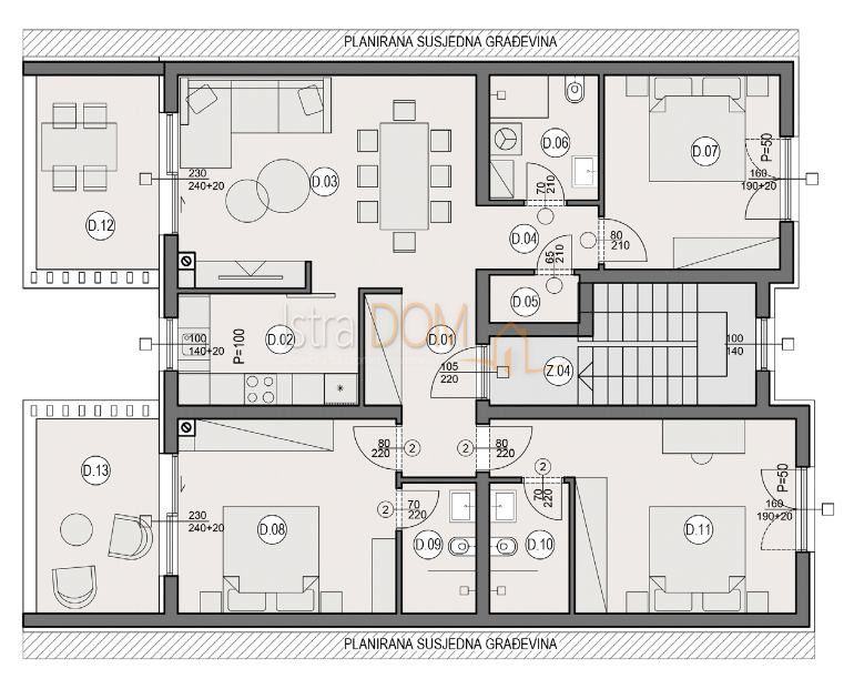 Stan na prvom katu nudi funkcionalan raspored s ulaznim hodnikom koji vodi u prostrani dnevni boravak, kuhinju i tri udobne spavaće sobe. Tri kupatila pružaju dodatnu praktičnost, dvije natkrivene terase nude savršeno mjesto za opuštanje ili uživanje u obiteljskim okupljanjima na otvorenom.