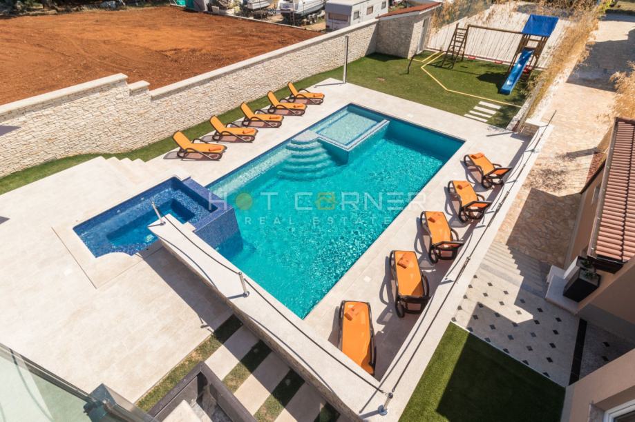 7. Veliki bazen za odrasle , mali bazen za djecu, jacuzzi sa masažom, vodopadom. Ukupna površina 67m2. Bazen ima grijanu vodu, sa dizalicom topline, važno za prije i nakon ljetne sezone.