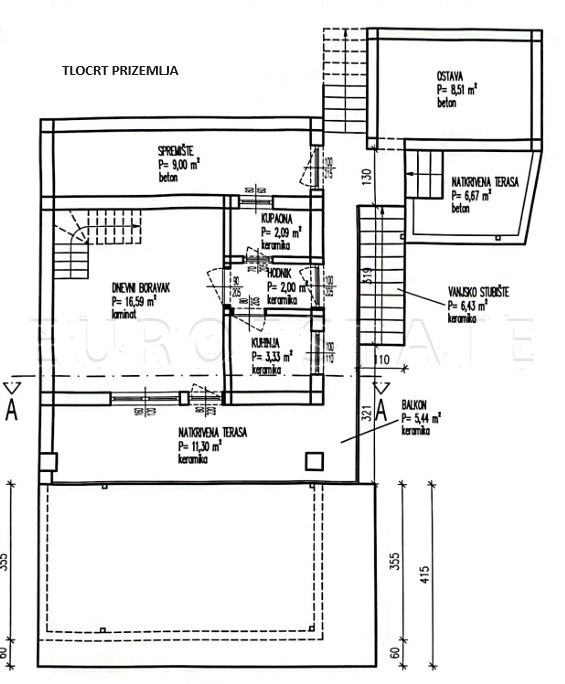 PRIZEMLJE: ostava, spremište, dnevni boravak, kuhinja, hodnik, kupaona, natkrivena terasa, vanjsko stubište, balkon