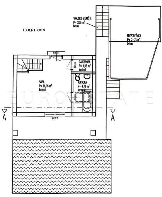 KAT: vanjsko stubište, nadstrešnica, soba, garderoba, kupaona