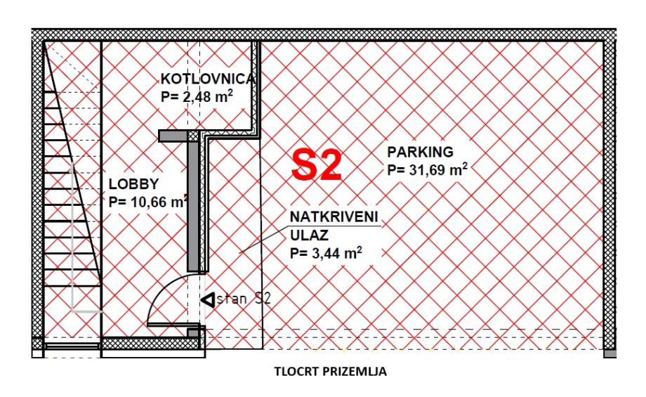 PRIZEMLJE: lobby 8.33 m2, kotlovnica 2.23 m2, natkriveni ulaz 1.72 m2, parking 19.1 m2