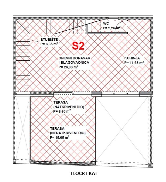 1.KAT: stubište 6.35, dnevni boravak i blagovaona 26.93 m2, WC 2.20 m2, kuhinja 11.65 m2, natkriveni dio terase 3.33 m2, nenatkriveni dio terase 3.91 m2
