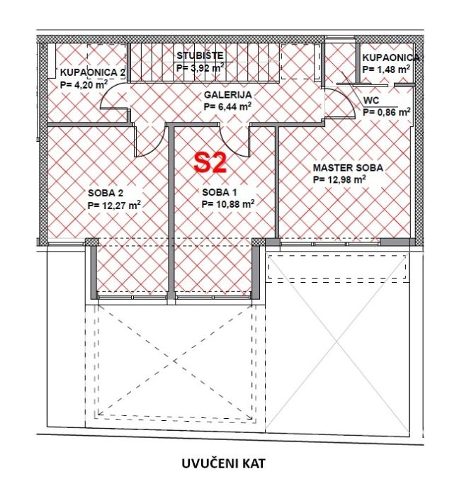 UVUČENI KAT: stubište 3.92 m2, galerija 6.44 m2, master soba 12.98, kupaonica 1 1.48 m2, WC 0.86 m2, soba 1 10.88 m2, soba 2 12.27 m2, kupaonica 2 4.20 m2