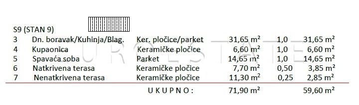 PRODAJE SE dvosoban stan oznake S9 na 2. katu stambene zgrade ukupne površine 71,90 m2 i neto korisne površine 59,60 m2.