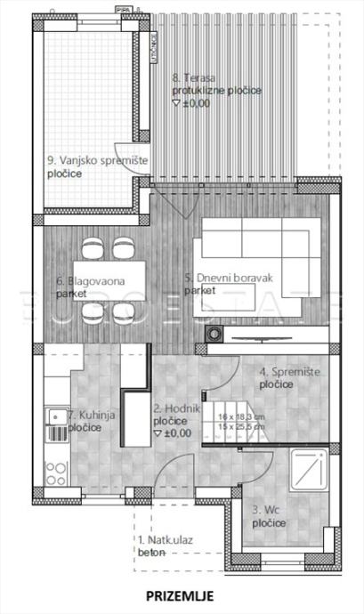 PRIZEMLJE: natkriveni ulaz, hodnik, WC, spremište ispod stubišta, dnevni boravak, blagovaonica, kuhinja, natkrivena terasa, vanjsko spremište