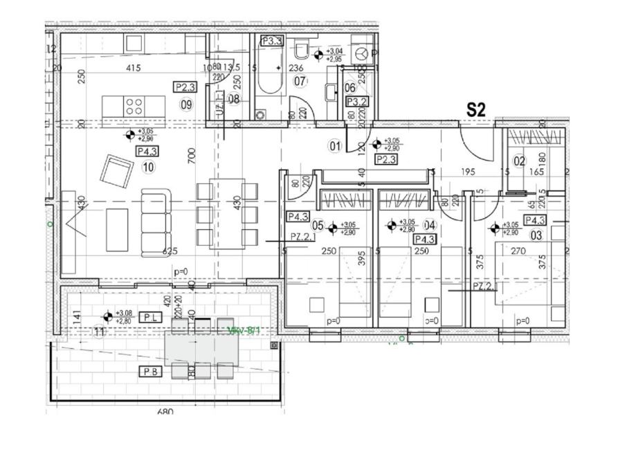 - stan oznake S2 smješten je na 1. katu zgrade sa ukupno 4 stambene jedinice i 1 poslovnim prostorom,