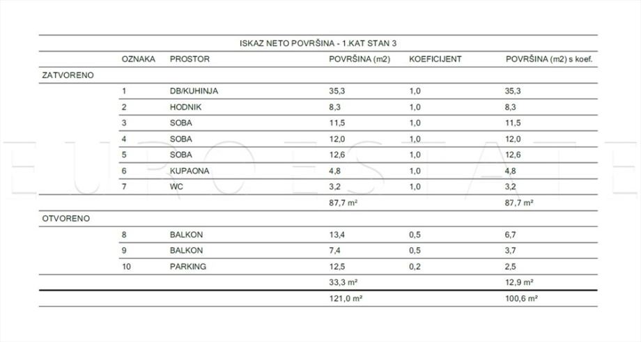 PRODAJE SE četverosobni stan u ekskluzivnoj novogradnji smješten na 1. katu urbane vile, ukupne površine 121 m2 i neto korisne (obračunske) površine 100.60 m2.