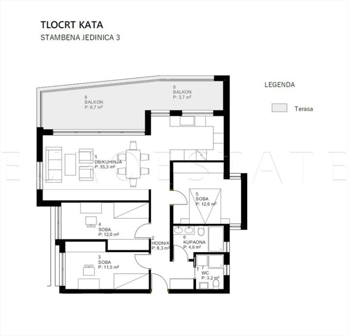 PROSTORIJE STANA: vidjeti priloženi tlocrt i popis prostorija sa površinama (STAN 3)