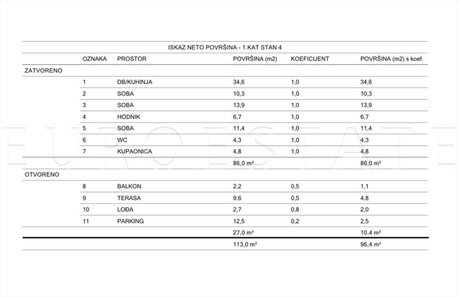 PRODAJE SE četverosobni stan u ekskluzivnoj novogradnji smješten na 1. katu urbane vile, ukupne površine 113 m2 i neto korisne (obračunske) površine 96.40 m2.