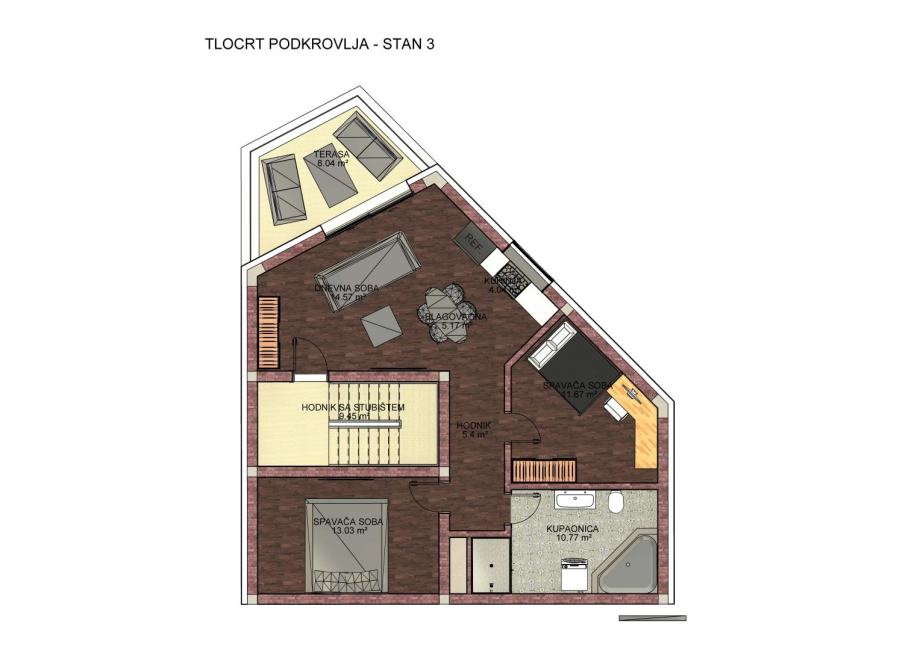 PRODAJE SE 4-sobni stan u novogradnji u potkrovlju urbane vile neto korisne površine 140,61 m2 sa dva pripadajuća parkiran mjesta i spremištem u prizemlju zgrade.