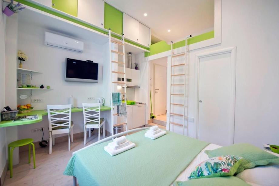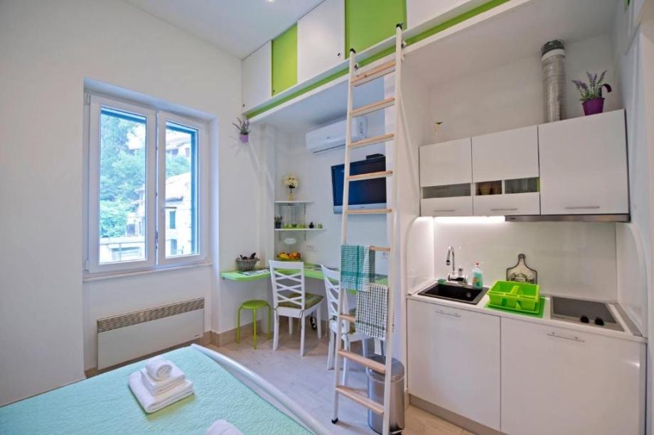 Stan se nalazi na 1. katu kuće, a sastoji se od dnevnog i spavaćeg dijela u jednom, galerije s dodatnim ležajem i kupaonice.