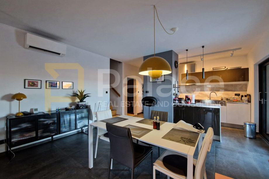 Sastoji se od prizemlja, prvog kata, ljetne kuhinje, zasebnog apartmana i predivne okućnice s bazenom.