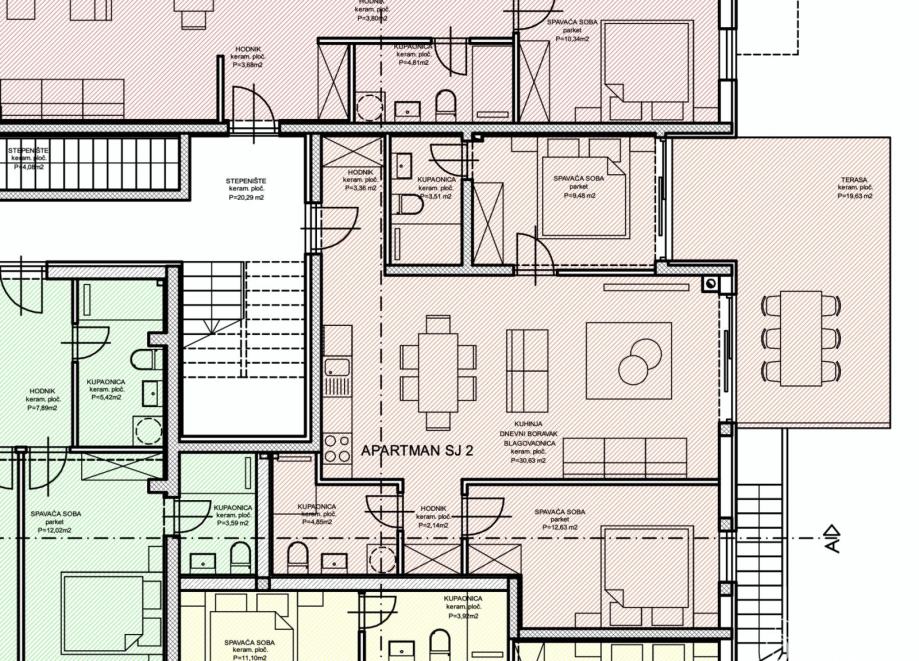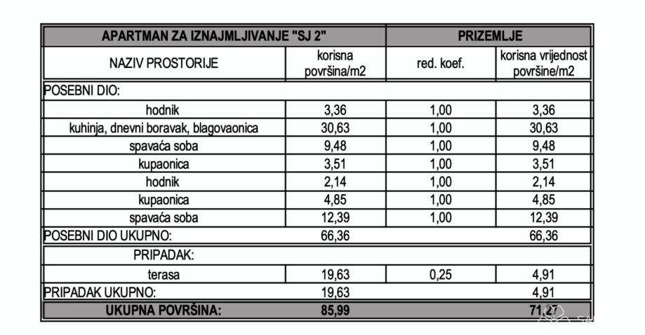 Apartman A-2 - prizemlje - stambena površina 66,36 m2 (2 spavaće sobe + 2 kupaonice) + terasa (20 m2 - JI) + vrt (32 m2) + garažno parkirno mjesto + ostava u podrumu, neto obračunske površine 85,57 m2 = 385.065 EUR