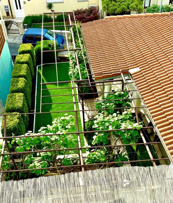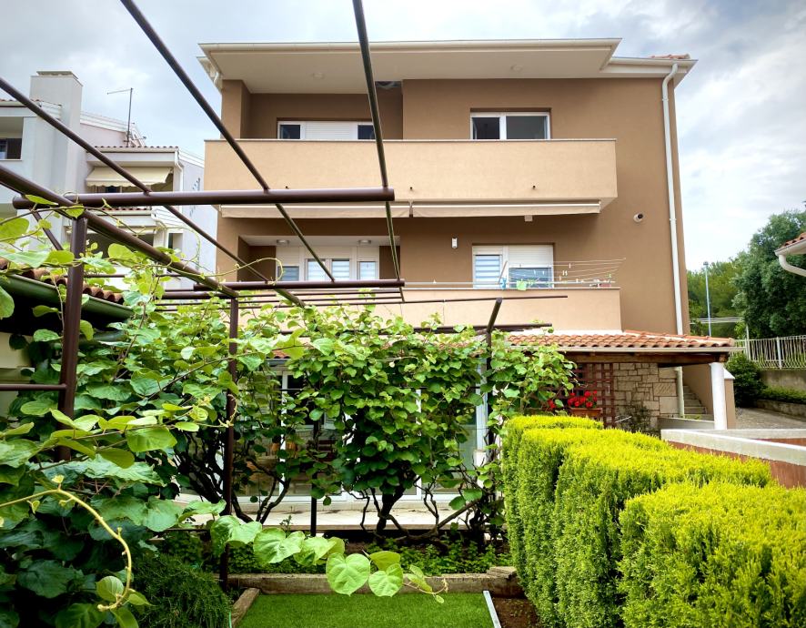 Oko kuće se prostire pažljivo uređen vrt, inspiriran estetikom ladanjskih vila iz austrougarskog razdoblja Pule. Uz kuću s desne strane nalazi se široki prolaz s parkirnim mjestima za tri vozila, od kojih je jedno natkriveno pergolom obrastalom vinovom lozom – za prirodni hlad tijekom ljetnih mjeseci. Oba stana su klimatizirana.