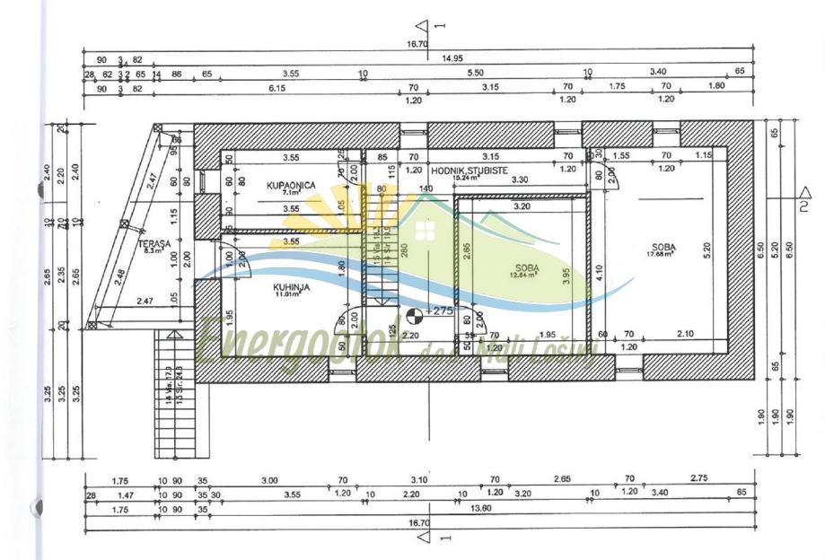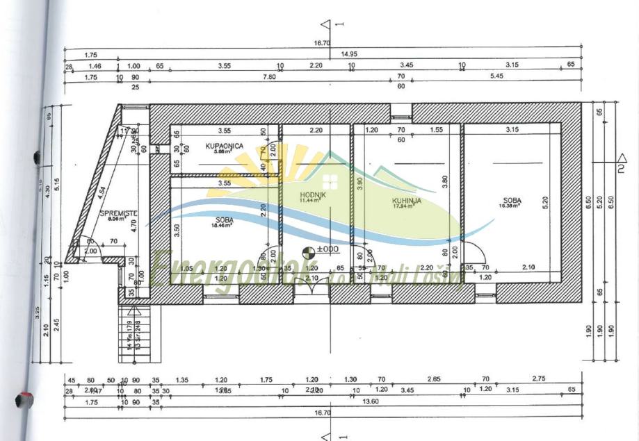 - Prizemlje (Stan 1) - kuhinja/blagovaonica, hodnik, kupaonica, 2 spavaće sobe i spremište - površine 78,46 m²